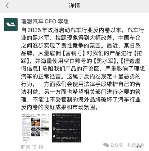「连日系品牌都知道用水军拉踩理想汽车是最安全的,可见过去几年我们面对黑公关、黑水军的隐忍,造成了多么恶劣的后果。从今天开始不忍了……」