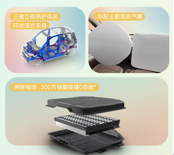 60%的高强钢环状笼式车身,关键部位用了1500MPa的热成型钢(造潜艇的级别),标配主副驾双气囊,还有ESC车身稳定系统。再加上那块300万销量零自燃的“神炼电池”,有AI云端实时监护。说实话,在这个价位段,这安全配置几乎是“天花板”了。