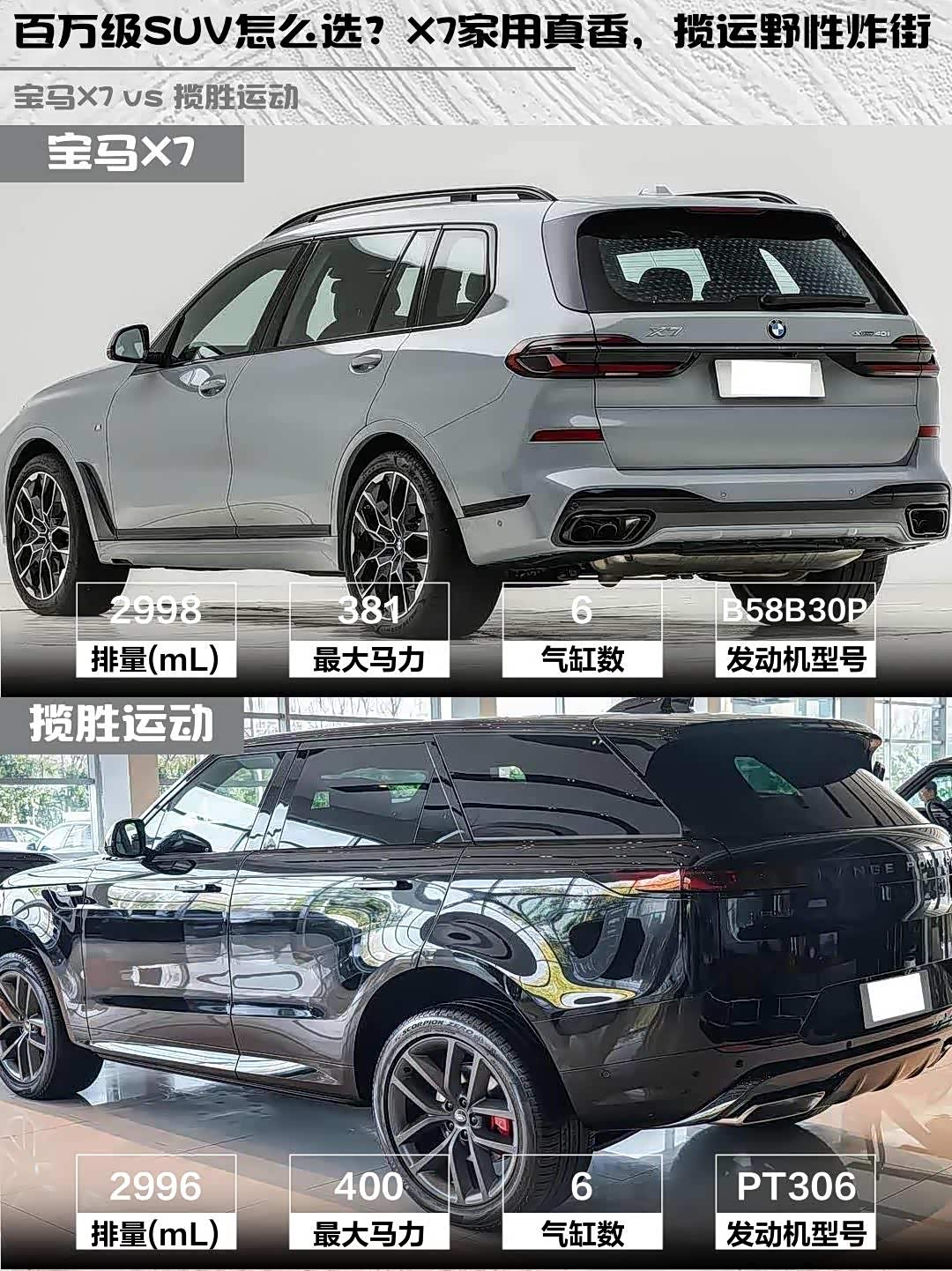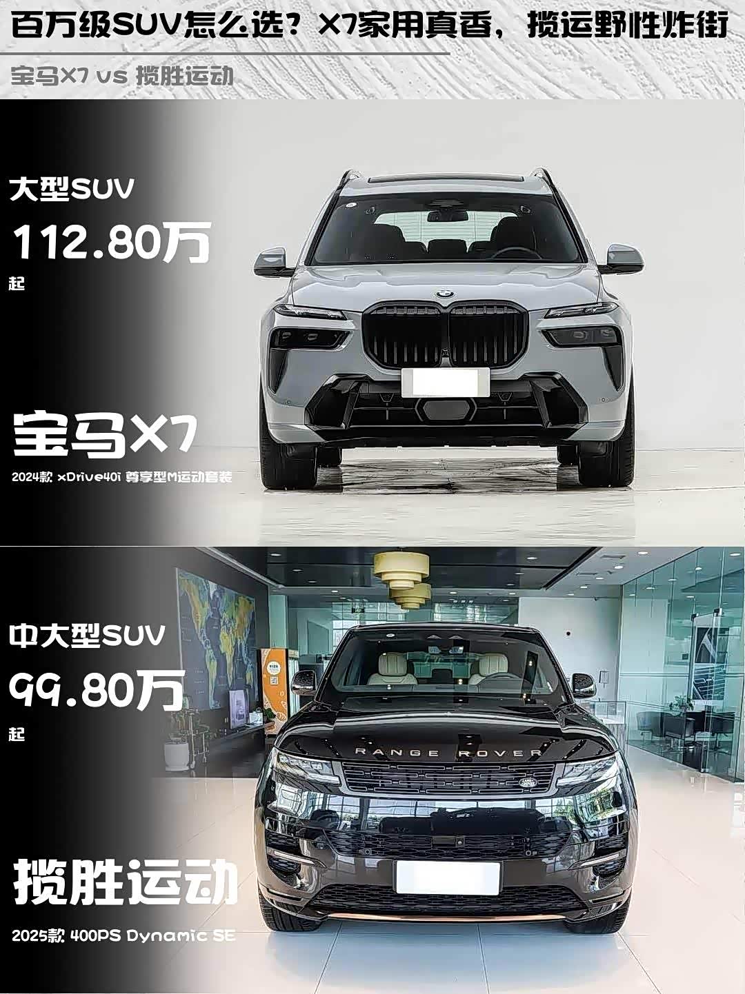 最近后台好多兄弟在问百万级SUV怎么选,今天就来聊聊2024款宝马X7 xDrive40i 尊享型M运动套装和2025款揽胜运动 400PS Dynamic SE这对神仙打架的选手!