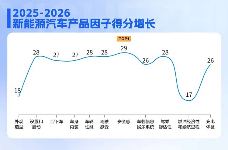 消费者对纯电车型的认知,已从“续航焦虑”彻底转向“体验优先”,从研究因子来看,安全感得分增长最多,达到了29分;续航满意度仅提升17分,涨幅最小且权重明显降低,这充分说明,随着三电技术成熟,用户续航刚需已得到充分满足,续航对购车决策的影响力持续弱化,这一结论与一线经销商的市场反馈相吻合。