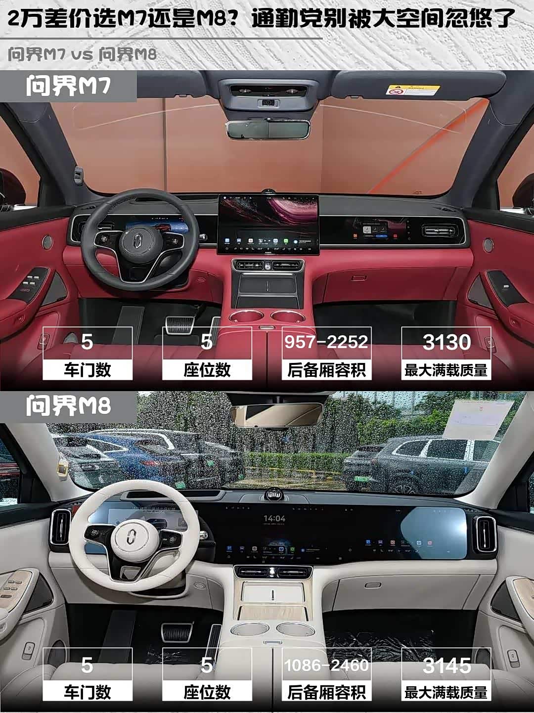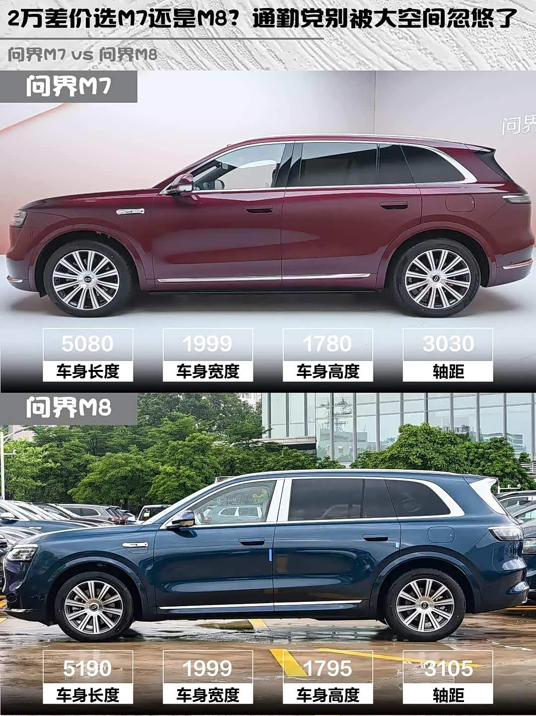 问界M7更适合:追求更高纯电续航、注重后排舒适性、预算控制在35万内的用户。问界M8则胜在更大装载空间和更低能耗表现,适合经常长途自驾的家庭。两车差价2万,建议根据实际使用场景选择,你们会更倾向哪款呢?🚗💨