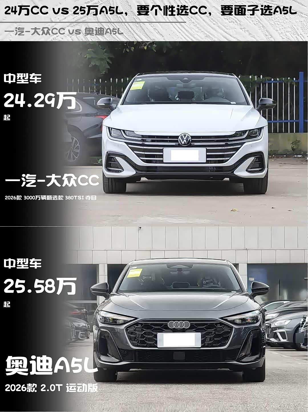 车家号·0浏览·2026-04-13 08:39 · 北京最近在纠结 一汽-大众CC(参数|询价) 2026款 3000万辆甄选款 380TSI 夺目和奥迪A5L 2026款 2.0T 运动版的朋友看过来!这两台轿跑我都深度试驾过,来聊聊真实感受👇