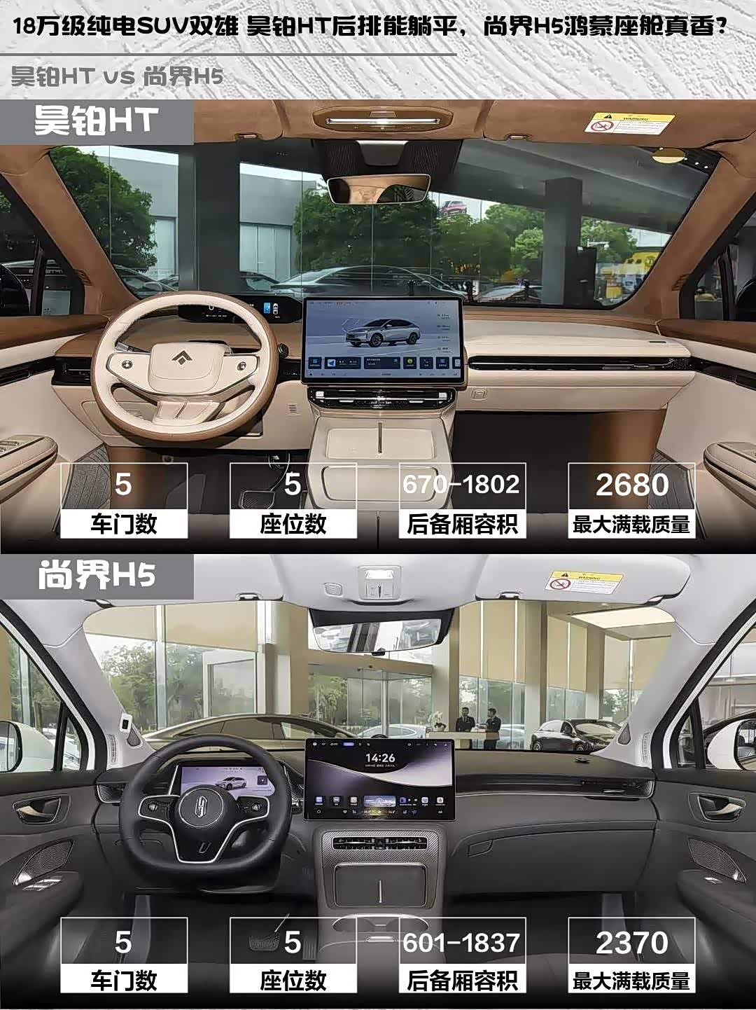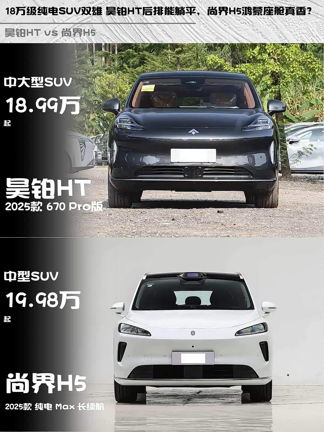 车家号·0浏览·2026-04-13 08:43 · 重庆最近在选纯电SUV,纠结 昊铂HT(参数|询价) 2025款 670 Pro版和尚界H5 2025款 纯电 Max 长续航,深度试驾后说说真实感受!🚗