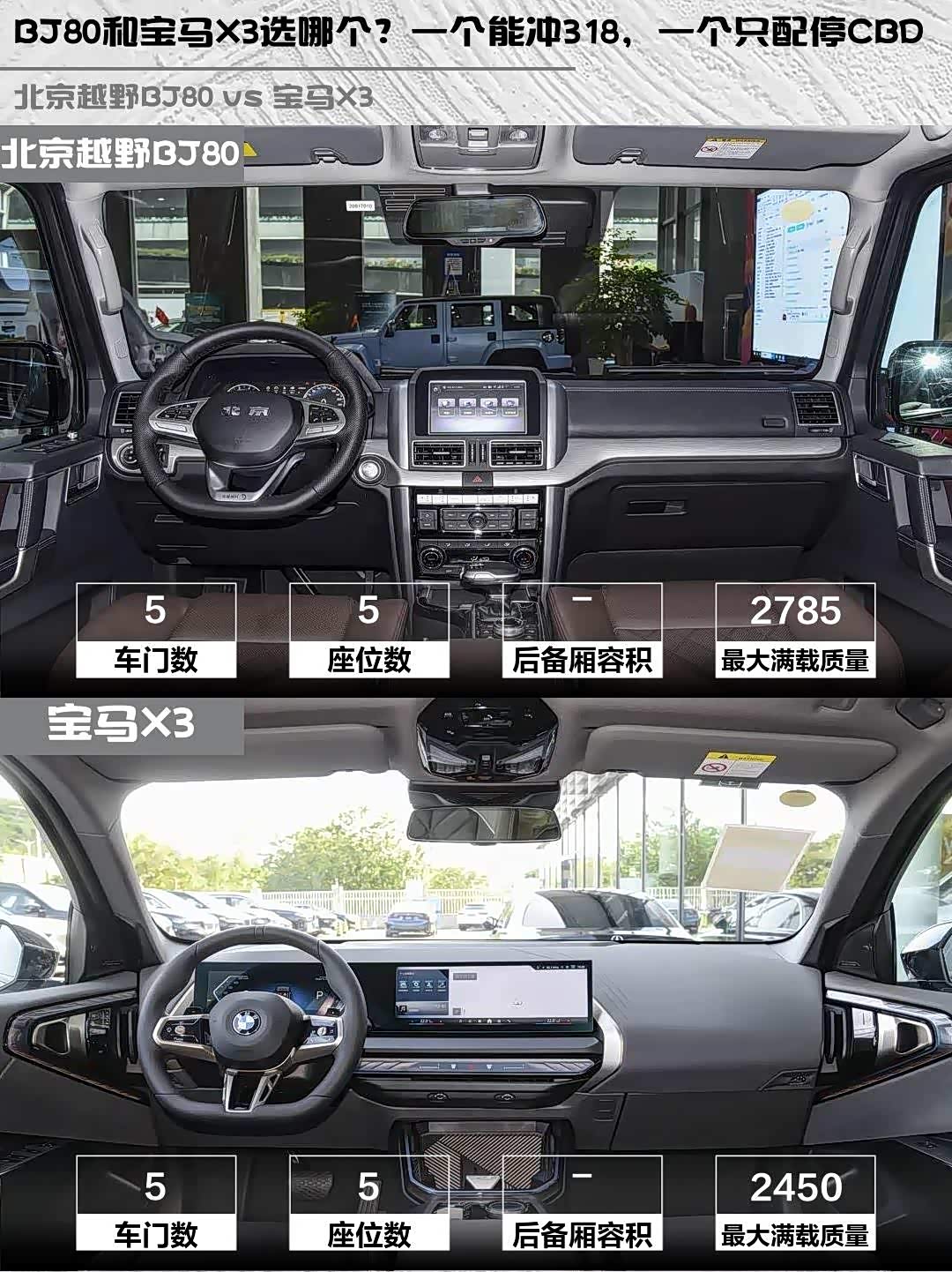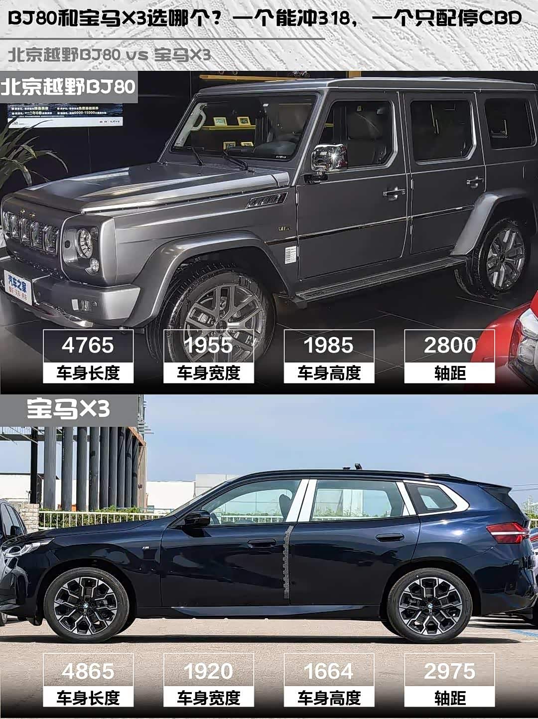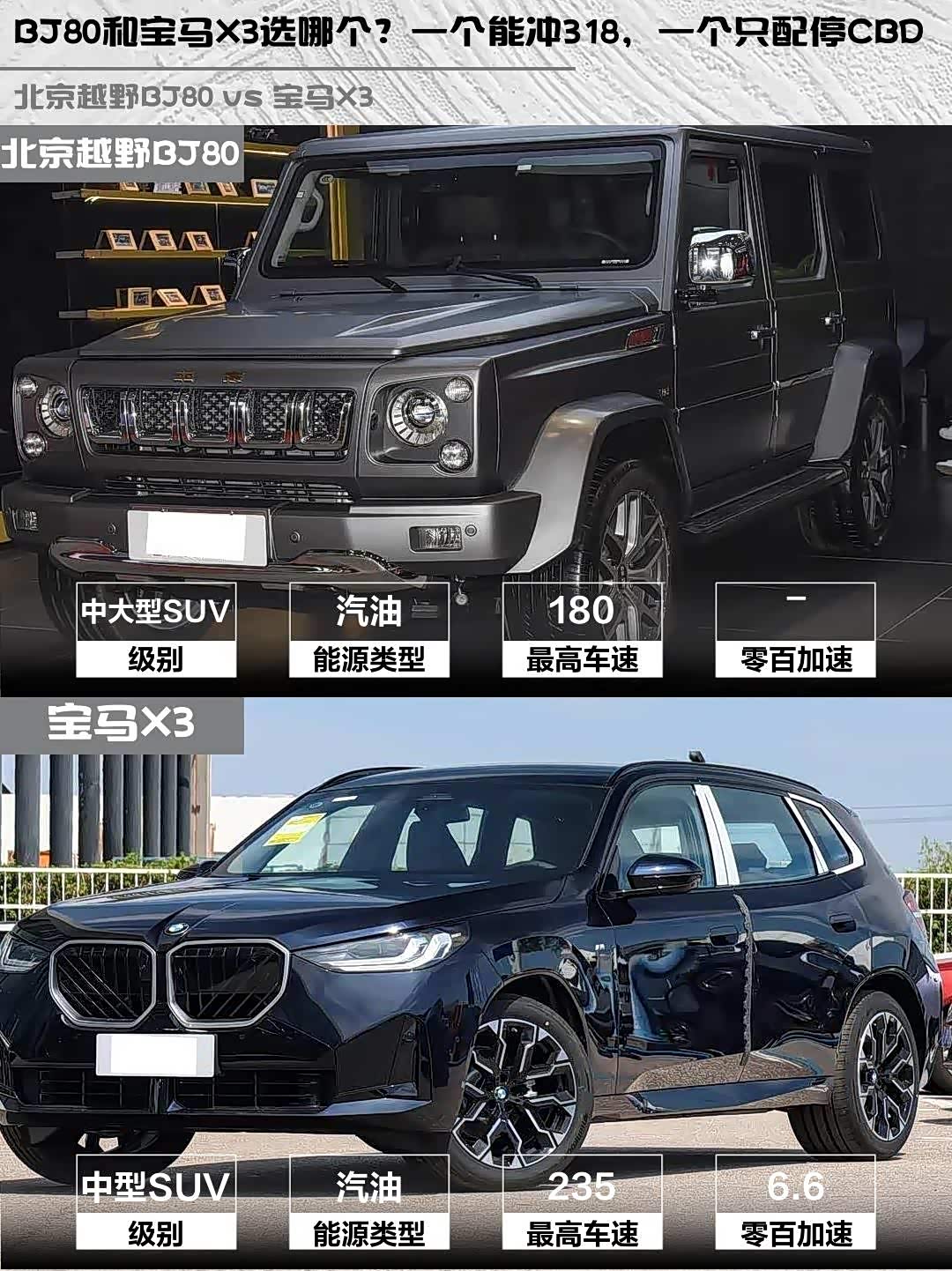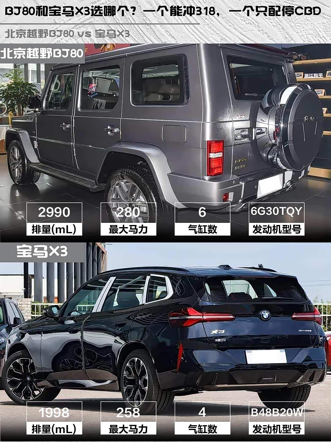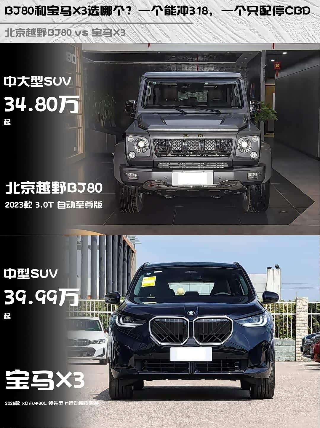 最近后台好多兄弟在问:硬派越野和豪华SUV到底怎么选?今天直接拉出两台代表选手—— 北京越野BJ80(参数|询价) 2023款 3.0T 自动至尊版 vs 宝马X3 2025款 xDrive30L 领先型 M运动曜夜套装,咱们掰开揉碎聊干货!🔥