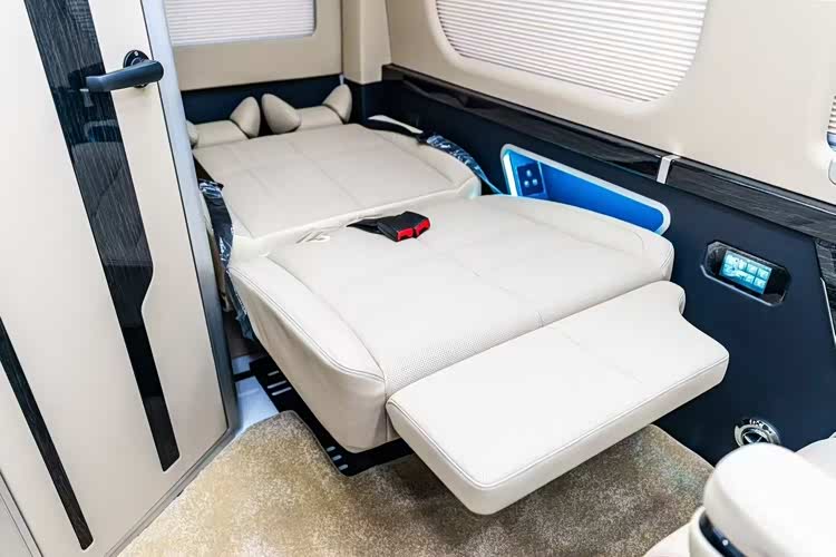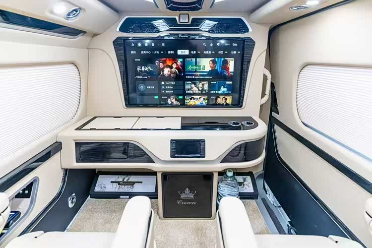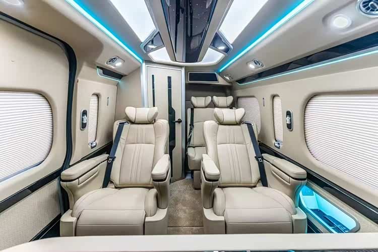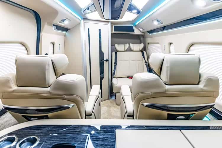 座椅表面采用精密的菱形绗缝工艺,不仅增加了座椅的美观度,还提升了其舒适度。此外,客户还可以根据自己的需求选配刺绣企业LOGO或家族徽章,让车辆更具专属感,彰显个人或企业的独特身份和品味。白色地板则选用高强度岩板材质。