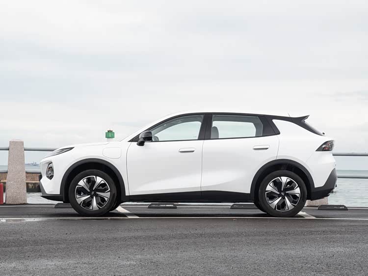 侧面造型方面,车顶带着明显的弧度,而且营造出了悬浮式车顶,同时还配备有鲨鱼鳍;圆润的腰线采用了贯穿式设计,点缀出了车身侧面的层次感;门把手则是半隐藏式设计,能够起到降低风阻的作用,同时也兼顾了实用性;轮眉和侧裙部分设计有粗壮的黑色饰板,进一步增强了力量感;轮毂则是五辐式低风阻造型,风格还算简洁。