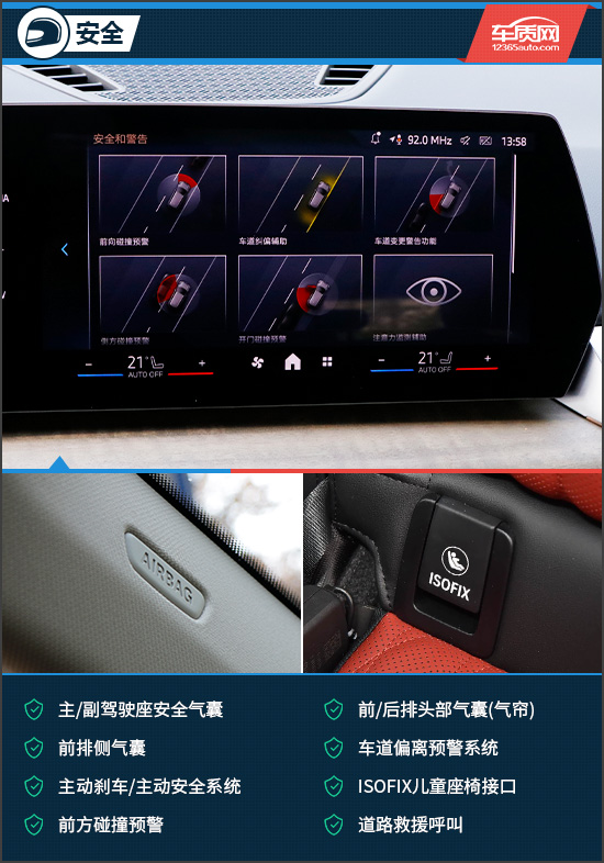 安全配置方面,评测车搭载了丰富的主/被动安全配置。例如前/后排头部气囊(气帘)、前排侧气囊、车道偏离预警系统、主动刹车/主动安全系统、前方碰撞预警等主/被动安全配置在评测车上均有配备,可以有效提升行车安全性。