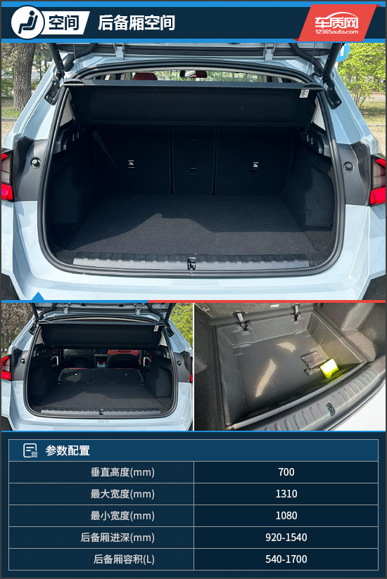 后备厢方面,评测车支持感应开启,打开后可以看到,内部十分规整,常规状态下容积达到了540L,可以放置5-6个登机箱。而将后排座椅靠背全部放倒后,此时容积提升至1700L,装载大件物品也游刃有余,实用性表现出色。