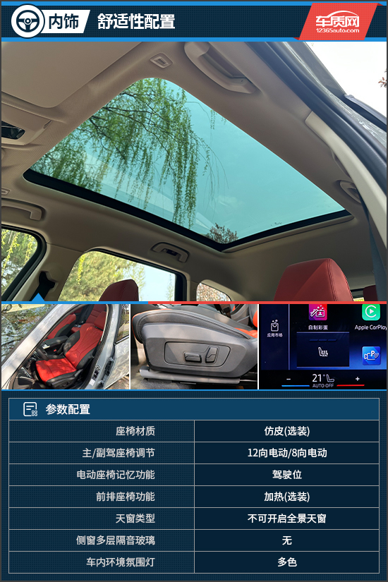 舒适性配置方面,评测车选装了仿皮材质座椅,表面采用珊瑚红搭配黑色,视觉效果颇为运动。此外,评测车还选装了座椅加热功能,但不支持选装座椅通风或座椅按摩功能,稍有遗憾。