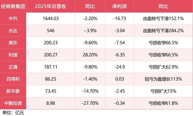 2025年,国内八家上市经销商集团中就有七家经营业绩惨淡。单纯从财报数据表面来看,除百得利控股实现312.8万元的股东应占溢利、勉强实现盈利外,其余七家经销商集团均陷入亏损泥潭,处境艰难。