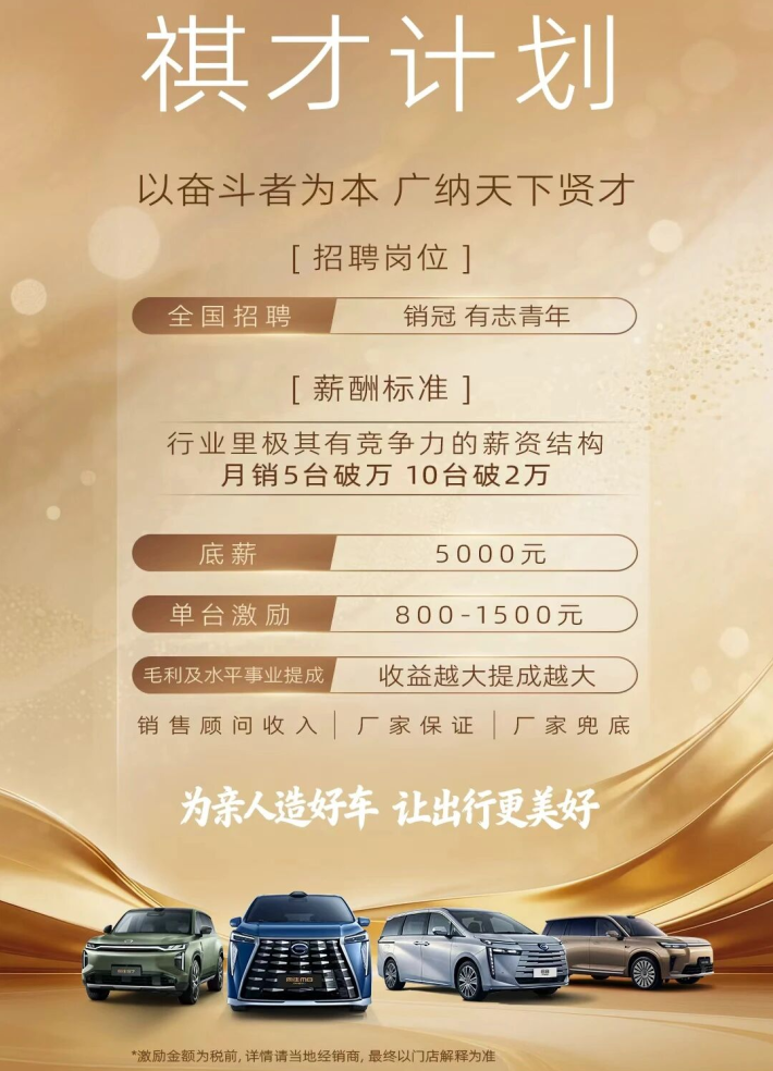 传祺同步启动的“祺才计划”,面向全国高薪招募销冠与行业有志青年,给出了行业极具竞争力的薪资结构:底薪5000元,单台激励800-1500元,月销5台收入即可破万、10台破2万,再加上上不封顶的毛利及水平事业提成,直接把终端销售的积极性拉满。(具体以实际门店为准)