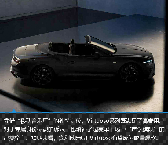 宾利欧陆GT Virtuoso以“声学艺术”为核心,将手工匠造、声学工程与超豪华设计融为一体,既是欧陆GT车系的全新标杆,也是宾利在超豪华领域“技术与艺术融合”的最新力作。作为2026年宾利推出的重磅特色车型,Virtuoso系列不仅为高净值人群提供了“移动音乐厅”级别的驾乘体验,更以差异化定位巩固了宾利在超豪华GT车型领域的优势地位,未来将持续吸引追求极致感官体验与奢华定制的消费者。