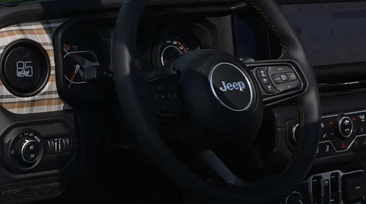 牧马人85周年纪念版同样以牧马人罗宾汉四门车型为基础开发,可选醇黑和皓白两款车漆。重点在于该车增加的85周年套装,具体涵盖尾门贴花、外挂式备胎防护软罩、变速箱防撞击护板、85周年换挡杆徽章、85周年杯架饰板、全新多功能集成真皮方向盘、格子布拼接皮质座椅(带标识牌)、方向盘加热、高级车门内饰板、全新真皮排挡杆、皮质包裹挡把、自动防眩目内后视镜、皮质包裹驻车制动手柄、前排遮阳板带化妆镜/照明灯、一号座椅发泡软垫、Rubicon专属Nappa真皮座椅、中控台中部格纹包覆饰条、前排座椅加热和灰/铜色越野认证徽章。