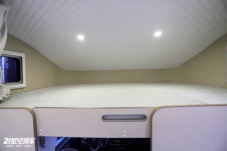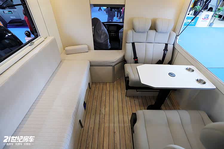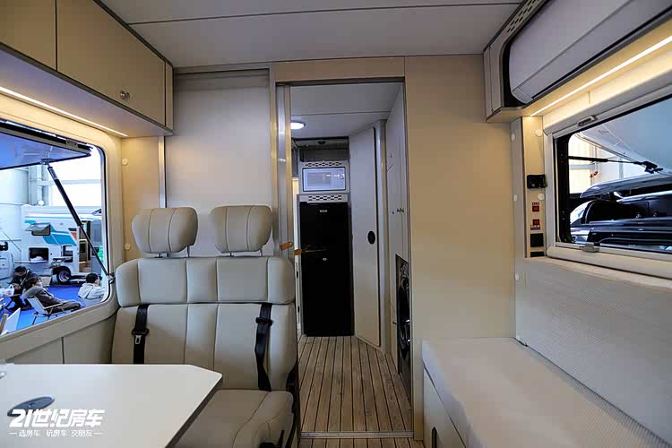 生活区采用对卡座沙发+卫生间+厨房吧台+侧沙发床的设计,2000x1300mm大额头床搭配1900x1100mm侧沙发床,后开门设计上下车更便捷,车内动线更合理,适合单人或双人长期旅居。