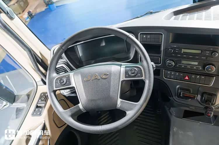 坐上驾驶座可以看到,江淮跨越X7纯电动牵引车提供了整洁、富有操控感的驾驶环境。方向盘采用四辐式多功能设计,驾驶员可在手不离方向盘的情况下操控各类车辆功能。仪表盘采用全液晶设计,可将各类行车信息一目了然地展示在驾驶员面前。