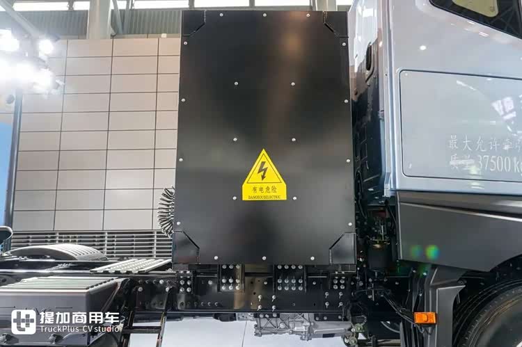 江淮跨越X7纯电动牵引车将电池箱放置在驾驶室后部,呈典型的背置结构。在当下新能源重卡中,电池是最昂贵的单一部件,同时也对车辆安全性至关重要。背置式电池结构规避了底置电池因离地间隙低而带来的安全隐患,能更好地应对复杂崎岖路况,这也是当前新能源重卡行业的常见解决方案。