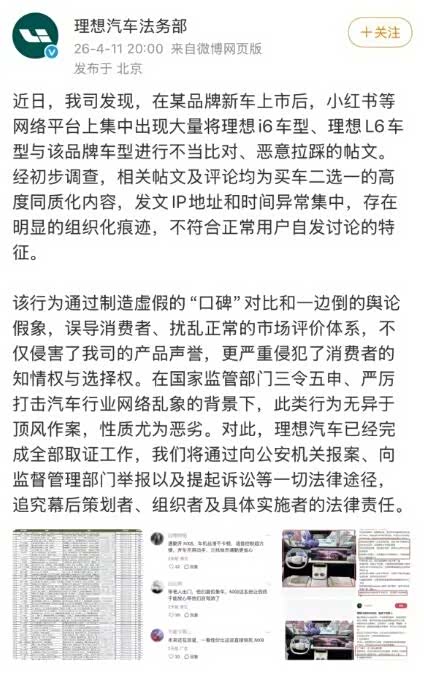 4月11日,理想汽车法务部一纸声明,撕开了新能源汽车行业竞争暗面的一角。声明直指,在某竞品新车上市后,公司遭遇“有组织、规模化的AI生成不实黑稿攻击”,大量针对i6、L6车型的恶意拉踩帖文集中涌现。