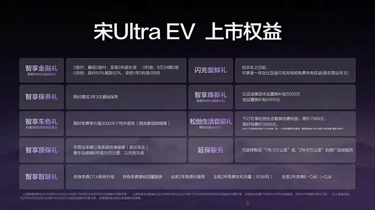 比亚迪王朝正在构建一个从购车、用车、到养车的全链路无忧体系。为此,宋Ultra EV带来了“0元购、0元用、0元养”的超重磅购车权益!同时还有其他丰富权益,为用户带来超值购车体验。