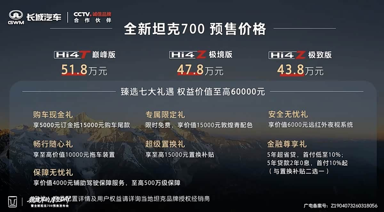 4月13日,坦克品牌对外透露了旗下中大型SUV新款坦克700的上市安排,这款备受关注的车型确定将于4月20日正式上市。在此之前,新车已经开启预售通道,共推出Hi4-T和Hi4-Z两个版本,其中Hi4-T仅有一个配置版本,预售价51.8万;Hi4-Z则提供两个车型选择,预售价分别为43.8万和47.8万,不同版本的定价差异,也对应着不同的产品定位和使用场景。