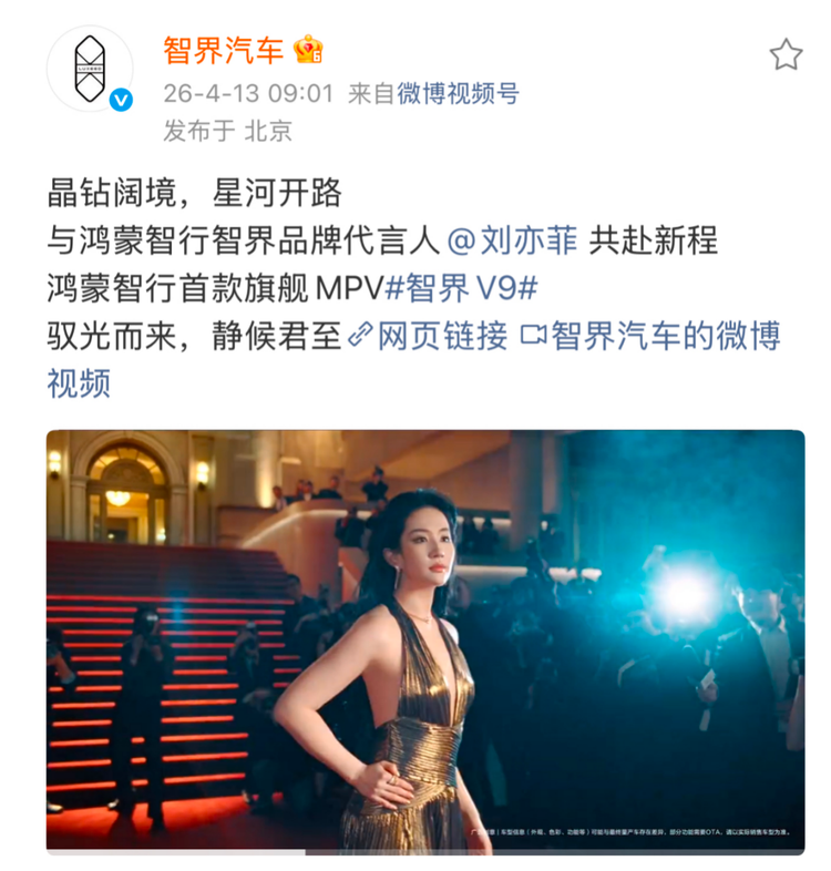 4月13日, 智界V9(参数|询价)智能交互式侧门光毯视频首发,刘亦菲正式出任品牌代言人的官宣同步落地,两大动作引爆全网讨论。在高端MPV市场持续向“科技豪华”转型的当下,智界V9以多项黑技术创新,为“MPV科技车皇”定位写下有力注脚。它跳出传统MPV“空间+舒适”的单一赛道,将仪式感、安全性与技术创新深度融合,重新定义了旗舰座驾的价值标尺。