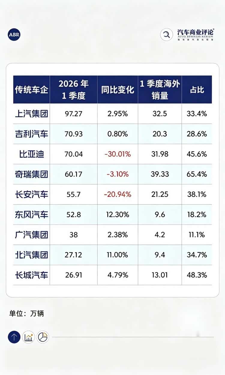 榜首易主、出口占比攀升、销量目标主动下调——一季度的信号很清楚:国内份额守不住、海外又打不开的车企,接下来的日子会越来越难。