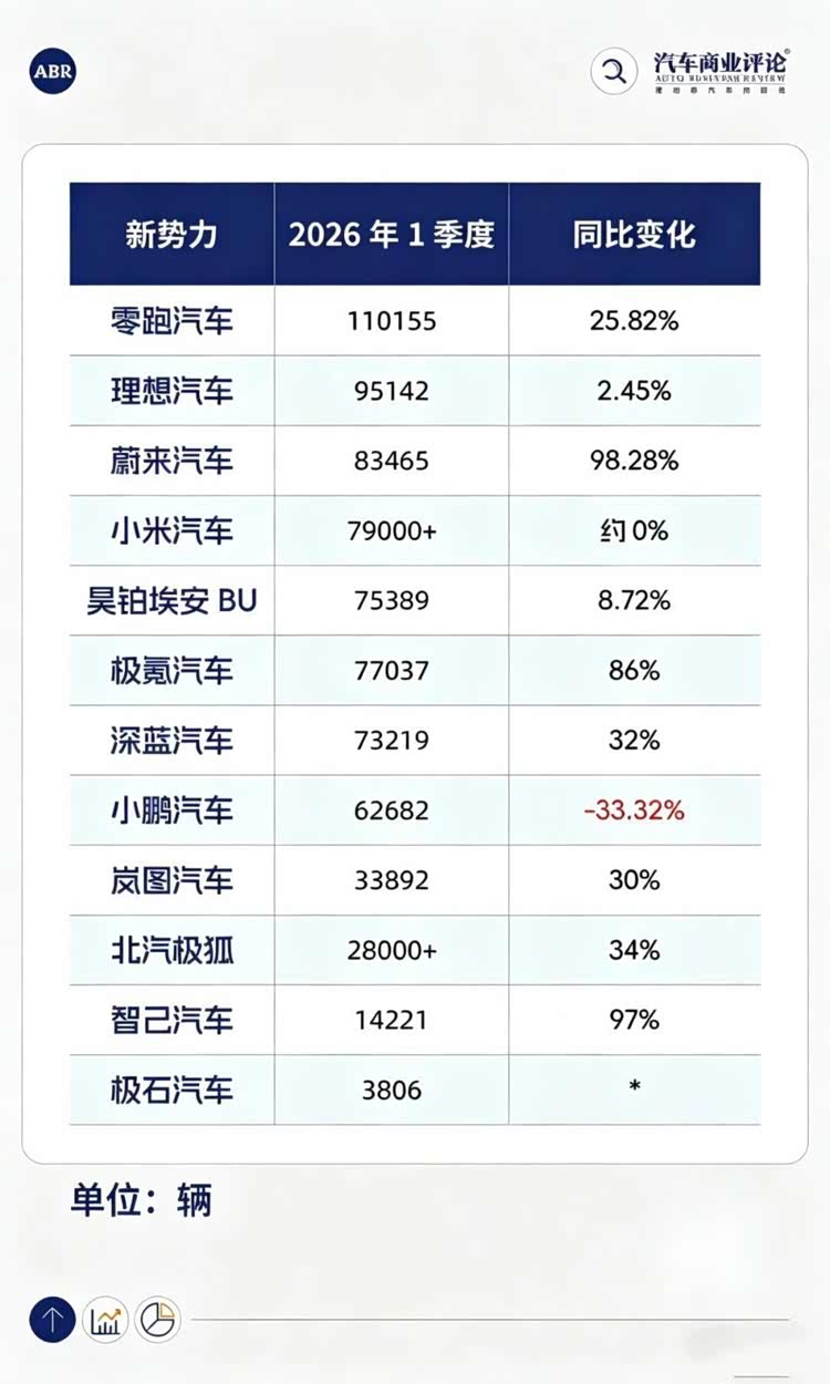 《汽车商业评论》将国内新势力划分为三大梯队:第一梯队,季度销量8万辆以上,包括蔚来、理想、零跑;第二梯队,季度销量6万~8万辆,涵盖小米、昊铂埃安BU、极氪、深蓝、小鹏;第三梯队,季度销量6万辆以下,代表为岚图、北汽极狐、智己、极石。
