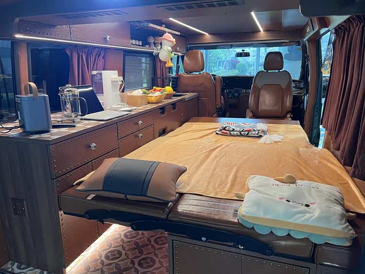 车里有8度电、驻车空调、柴油暖风机、50L清水箱、热水器、冰箱。后排折叠沙发床展开2.3×1.35米,高密度海绵垫,我1米8躺平没问题。全车隔音保温,冬天不冷夏天不热。
