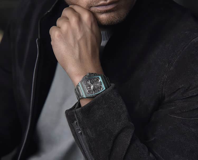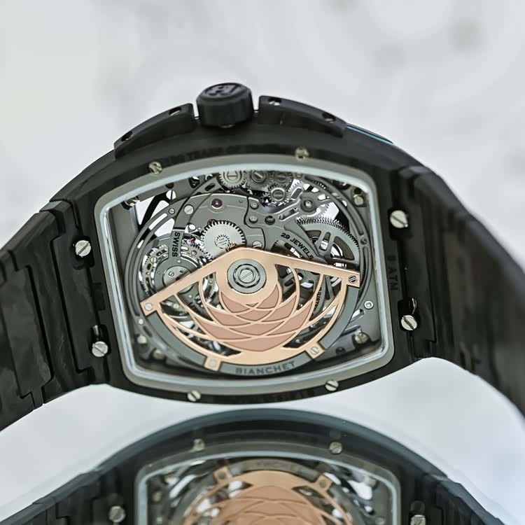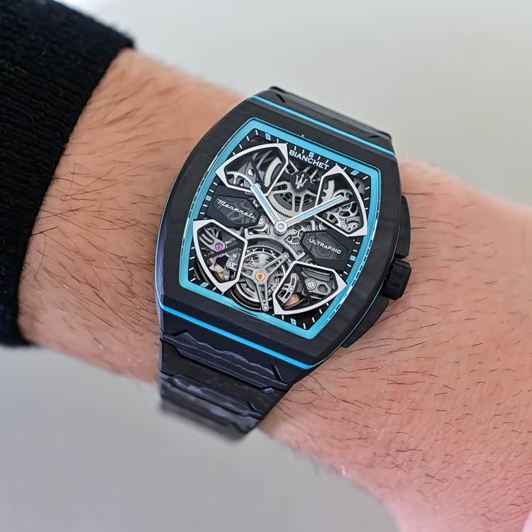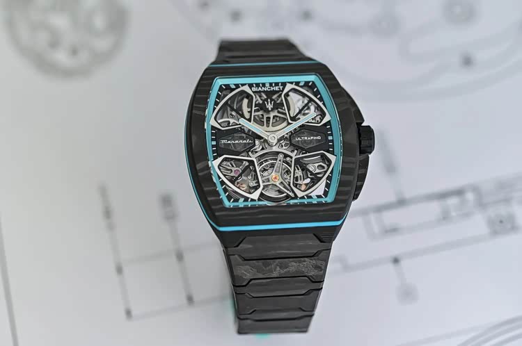 手表的设计还是非常有特色的,镂空的表盘设计灵感来源于玛莎拉蒂MCPura的合金轮毂,表盘细节则采用了与MCPura相同的AI Aqua Rainbow饰面,高密度碳纤维表壳和表链则与MCPura的单体式车身结构相呼应。蓝宝石水晶表镜下是Bianchet的UT01机芯,是一款手工精制的自动上链机芯,厚度只有3.85mm,但是却能够承受高达500G的冲击力。手表的飞行陀飞轮框架采用的是五级钛金属打造,在不含表带的情况下,手表的重量仅有36克,不得不说,工艺技术还是很可以的。