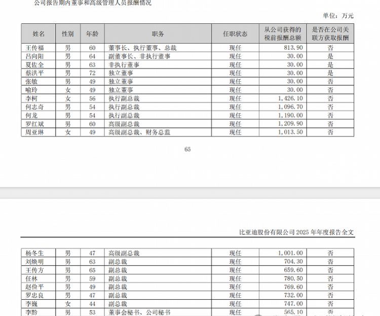 车家号·0浏览·2026-04-13 12:36 · 北京日前,比亚迪(002594.SZ)发布2025年年度报告,其中高管薪酬引发市场广泛关注。年报显示,公司执行副总裁李柯以1426.1万元年薪居首,何志奇、何龙、罗红斌、杨冬生等多名高管薪酬均突破千万元大关。其中,高级副总裁兼财务总监周亚琳以1013.5万元税前年薪,成为A股首位年薪破千万的财务掌门人。此前,A股CFO最高薪酬为美的集团钟铮的946万元。