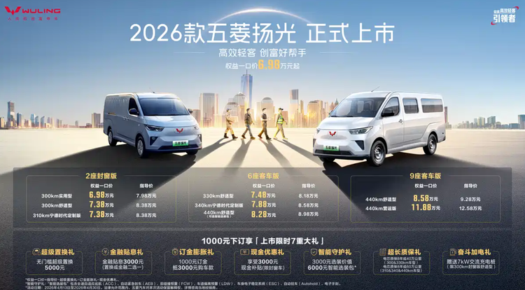 车家号·0浏览·2026-04-13 15:08 · 北京4月13日,上汽通用五菱旗下微面车型——2026款 五菱扬光(参数|询价)正式上市,8款车型的售价在7.98万-12.58万元之间,权益后一口价6.98万起。即日起购车,可享无门槛超级置换5000元或金融贴息3000元、支付1000元订金可抵扣3000元购车款、至高3000元现金补贴(部分车型)、赠送7kW交流充电桩(指定车型)多重好礼。详细售价及权益请见下图: