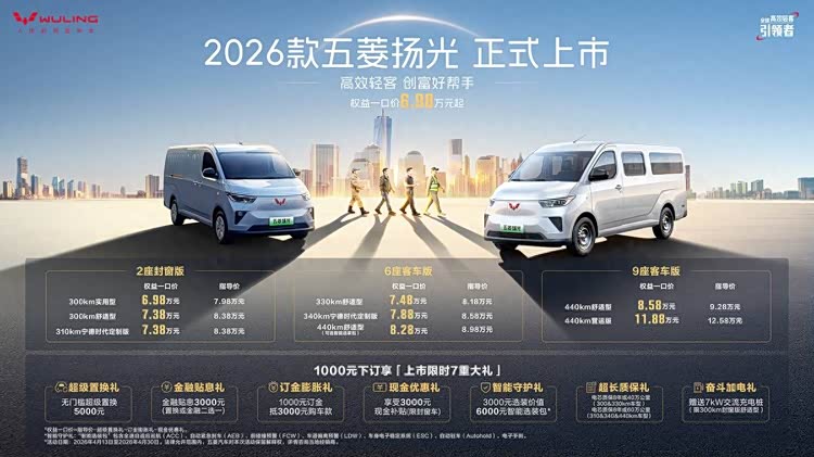 4月13日,2026款 五菱扬光(参数|询价)正式上市,限时一口价6.98万元起。五菱这次铺开8款车型,把续航顶到了440km,电机也从75kW升级到了100kW,甚至连辅助驾驶都给配上了。