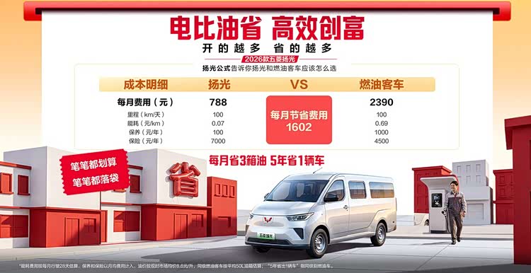 以前大家习惯用低价抢人,现在五菱直接把话题拉回到“运营成本”。每公里成本约0.07元,而同级别的油车要0.69元。按每天100公里来算,扬光一个月能比油车省下1600多块,跑个五年,能省出一台新车的钱。