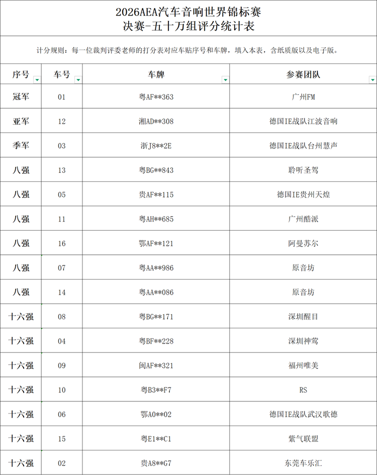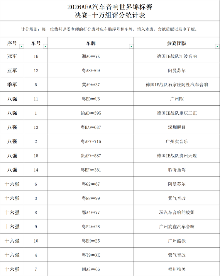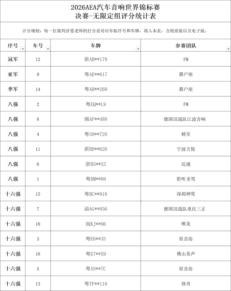 2026AEA第十二届汽车音响世界锦标赛-总决赛,是对过去一年汽车音响改装成果的集中展示,更是一场汽车音响文化的盛大狂欢。随着中国汽车音响市场的不断成熟,AEA将持续发挥平台优势与引领作用,助力行业创新发展,让更多人感受到汽车音响改装的独特魅力。再次鸣谢赛事战略合作伙伴德国IE,赛事赞助商迪贝斯音响,以及广告赞助商:宁波达通电子线缆有限公司、辉腾声学鲨鱼线材对赛事的大力支持。