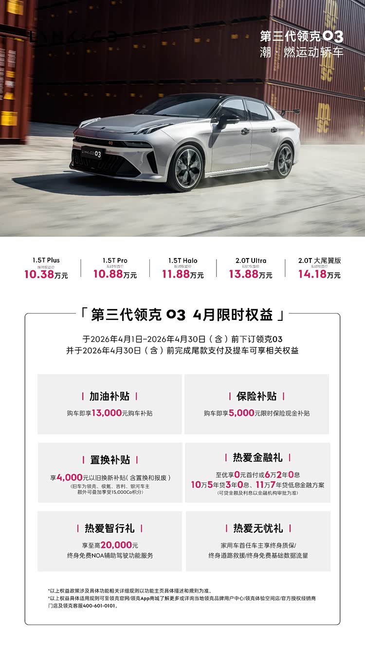 再说价格。官方15.98万,4月限时加油补13000、保险补5000,到手14.18万。置换再补4000,老车主加15000积分。金融有0首付或6万2年0息。首任车主终身质保、道路救援、基础流量。提车当天还能跑赛道、参加驾控营,教练手把手教走线。这笔账怎么算都不亏。喜欢性能车的,这波作业直接抄!