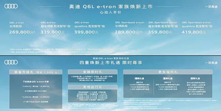A6L e-tron,是中大型豪华纯电轿车的均衡之王、标杆之作;Q6L e-tron家族,是豪华纯电SUV的全能选手、价值新标。