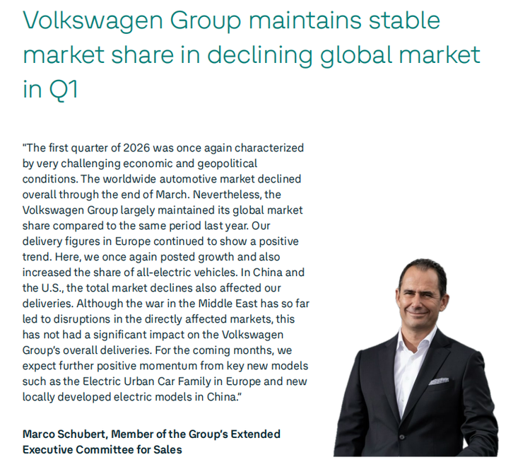 具体来看,大众汽车集团一季度在中国内地市场向客户交付54.8万辆汽车,面对充满挑战的市场环境,集团一季度市场份额提升到了12.7%,较去年同期增长0.4个百分点。