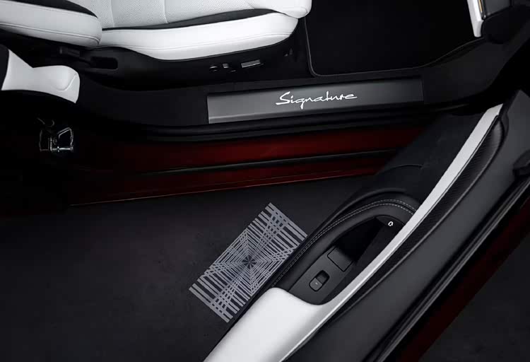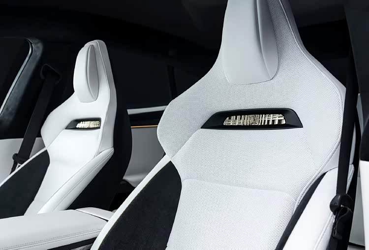 内饰同样经过专属定制,以纯净白色为主色调,大面积应用Alcantara翻毛皮材质,辅以金色缝线、金色饰条及专属座椅徽标。座椅上配有金色Plaid徽标,座椅边缘带有金色滚边。