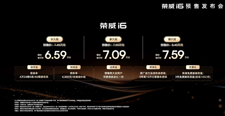 4月13日,全新荣威i6正式开启预售,这次共带来三款不同配置的车型,分别命名为长久版、豪久版和臻久版。作为一款换代紧凑型车,它没有延续老款的设计思路,而是换装了全新的设计语言,动力方面则搭载了1.5L发动机。此次预售推出了限时抢订价和常规预售价两种价格方案,限时抢订价从6.59万起步,最高7.59万,常规预售价则在7.49万到8.49万之间,价格区间贴合主流家用消费群体的预算,没有过高的门槛。