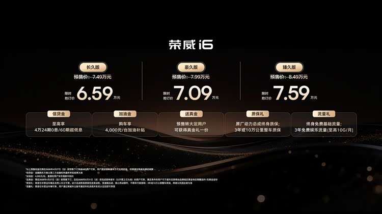 “买车就送真金。”4月13日,荣威i6开启预售,这句口号引来不少围观。限时抢订价6.59万至7.59万,三款车型名字很有意思:长久版、豪久版、臻久版。摆明了冲着“省油、耐久”四个字去的。