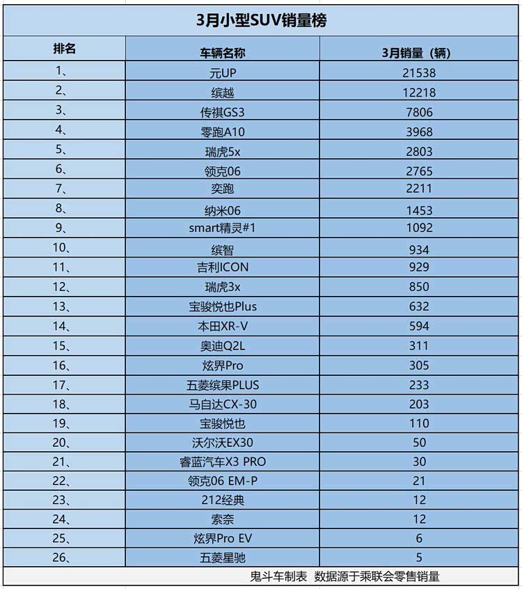 奥迪Q2L、炫界Pro、五菱缤果PLUS、马自达CX-30、宝骏悦也,这几款小型SUV在3月零售销量都超过100辆,此外,沃尔沃EX30、睿蓝汽车X3 PRO、领克06 EM-P、212经典、索奈、炫界Pro EV、五菱星驰,这几款小型SUV也出现在榜单上。
