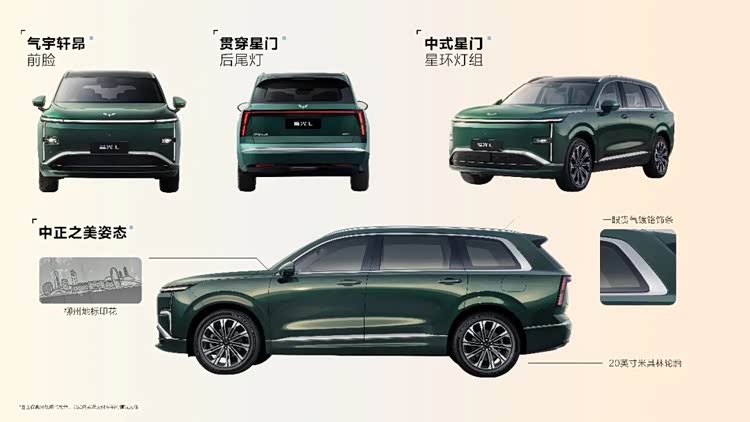 外观上,星光L走的是中式美学路线,不张扬但耐看。前脸“气宇轩昂”造型配合主动进气隔栅,沉稳中透着层次感。中式星门灯组与贯穿式尾灯前后呼应,夜间点亮时辨识度很高,回家停车也有仪式感。20英寸米其林轮胎是加分项,抓地力和静音表现都有保障。前风挡下角还有柳州地标印花,尾部隐藏了后挡风雨刮,这些细节虽小,却能看出设计师对实用性的思考——雨刮藏起来,既美观又减少风噪。