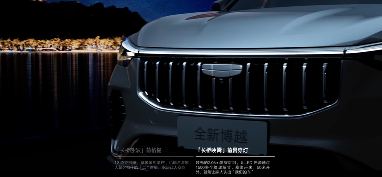 第一眼看到全新博越,很难不被它的前脸吸引。“长桥卧波”式的前格栅,灵感取自江南廊桥,12道竖向栅条并非简单的装饰,其秩序化的阵列与高光烫印工艺,在光影下呈现出桥柱般的坚实感。衔接它的是一条长达2.05米的“长桥映霄”前贯穿灯,这组与极氪、奔驰同源的欧司朗灯组,照射距离领先同级40米,能轻松覆盖两个足球场的宽度。这种设计不是为了炫技,而是在夜间点亮时,自然流露出“万家灯火”的暖意。