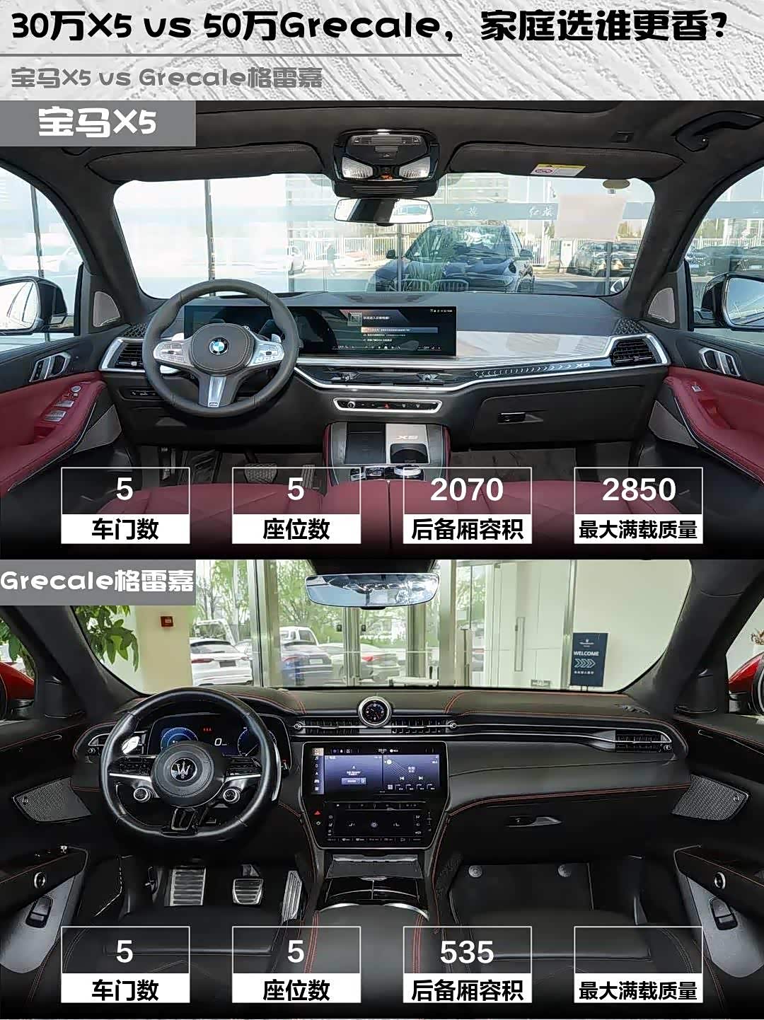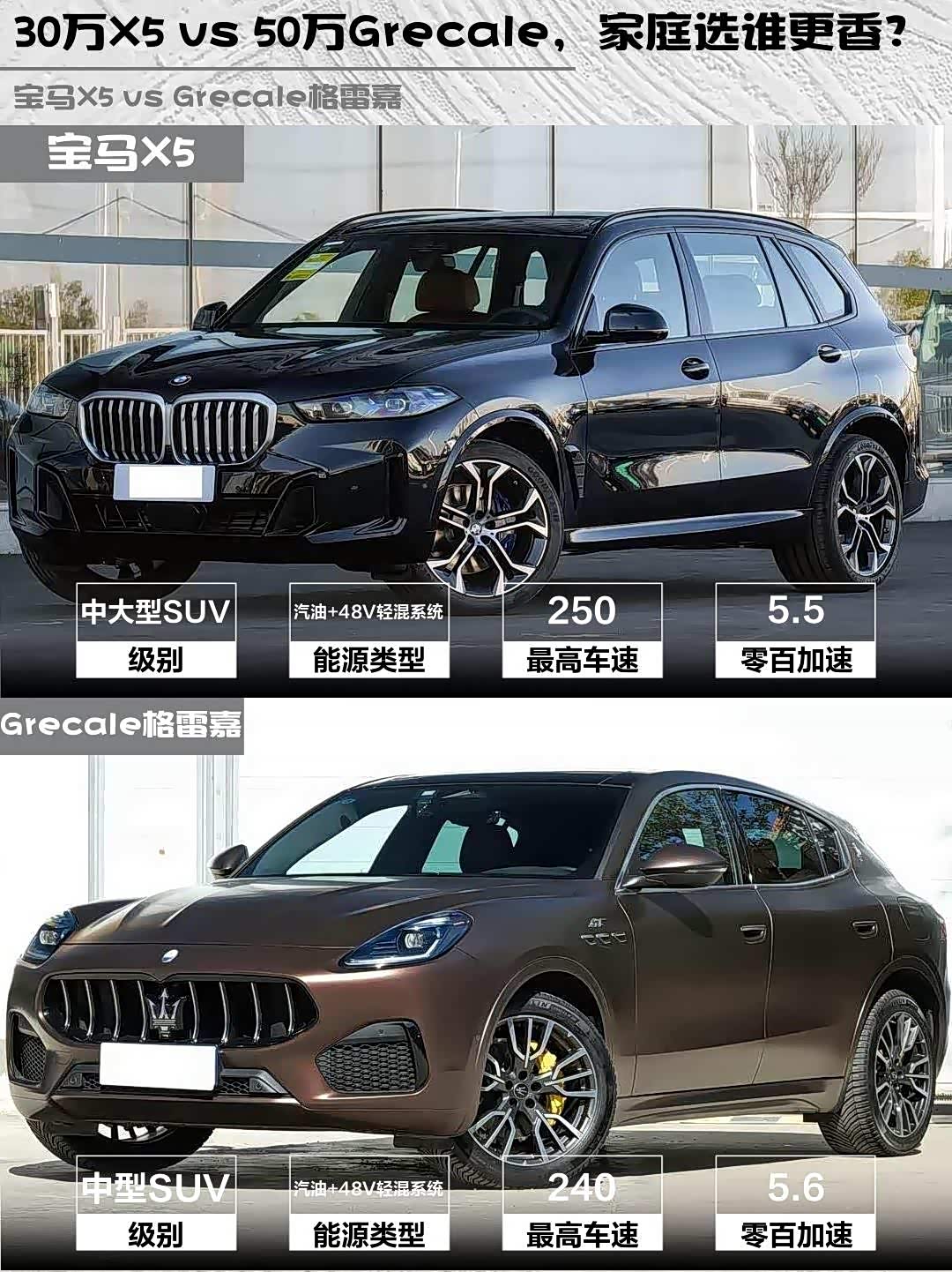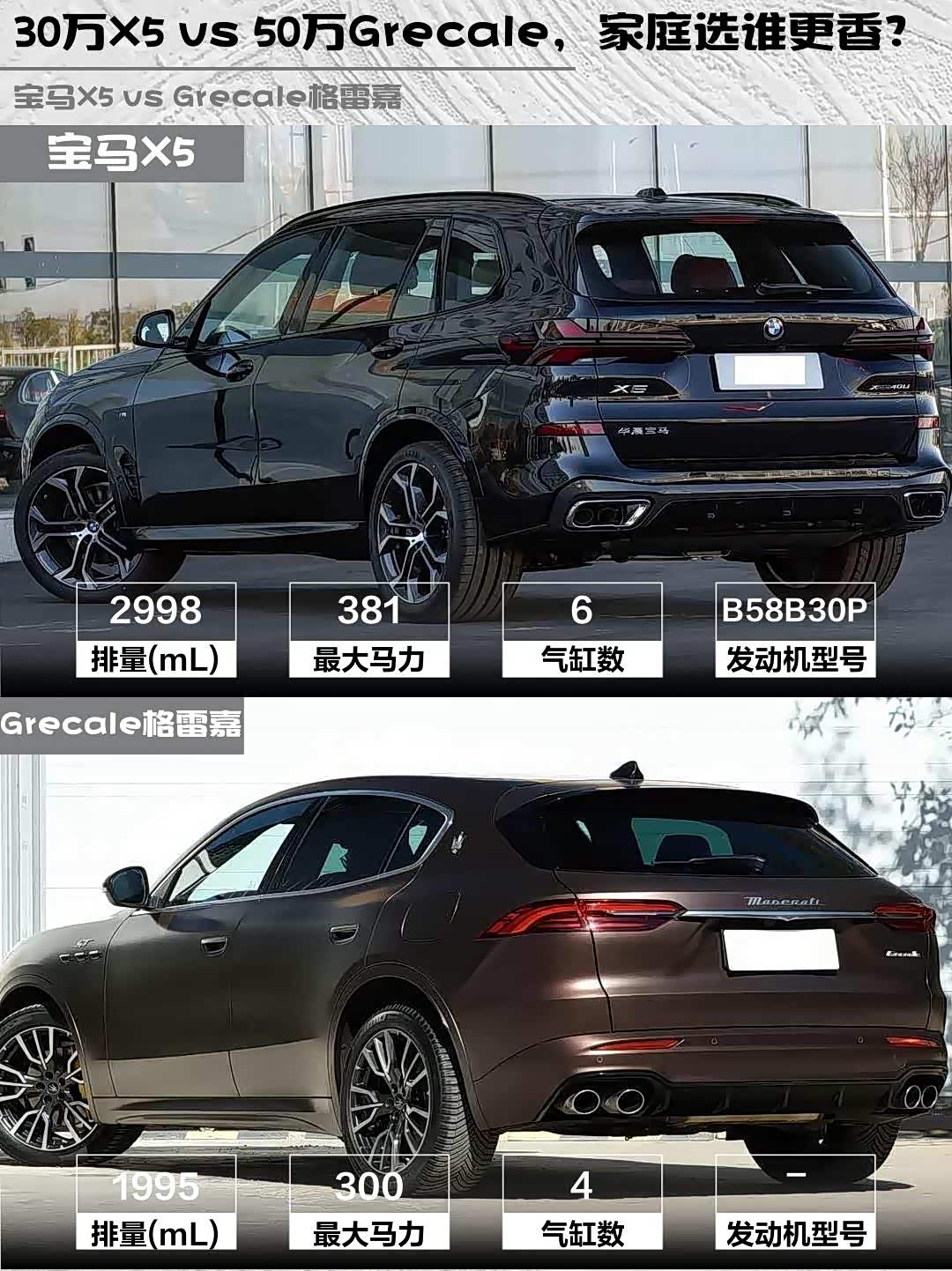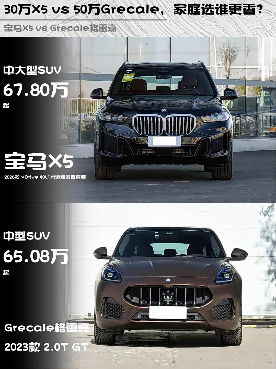 要品牌调性+个性选Grecale,但记得选装天窗和音响;追求全面均衡就选X5 40Li,3.0T六缸的平顺性和改装潜力都更好。偷偷说一句,现在X5的终端优惠比玛莎实在多了~