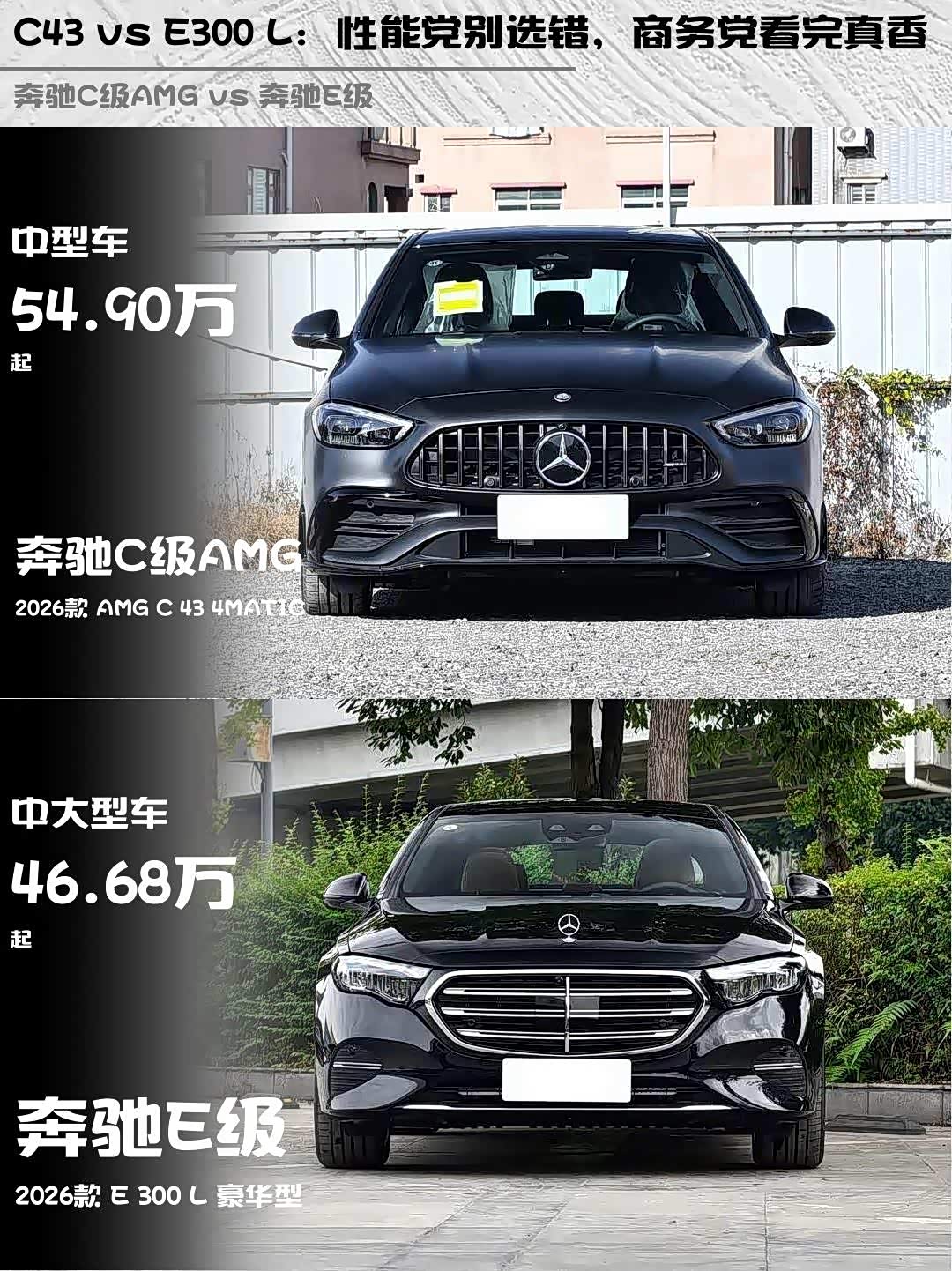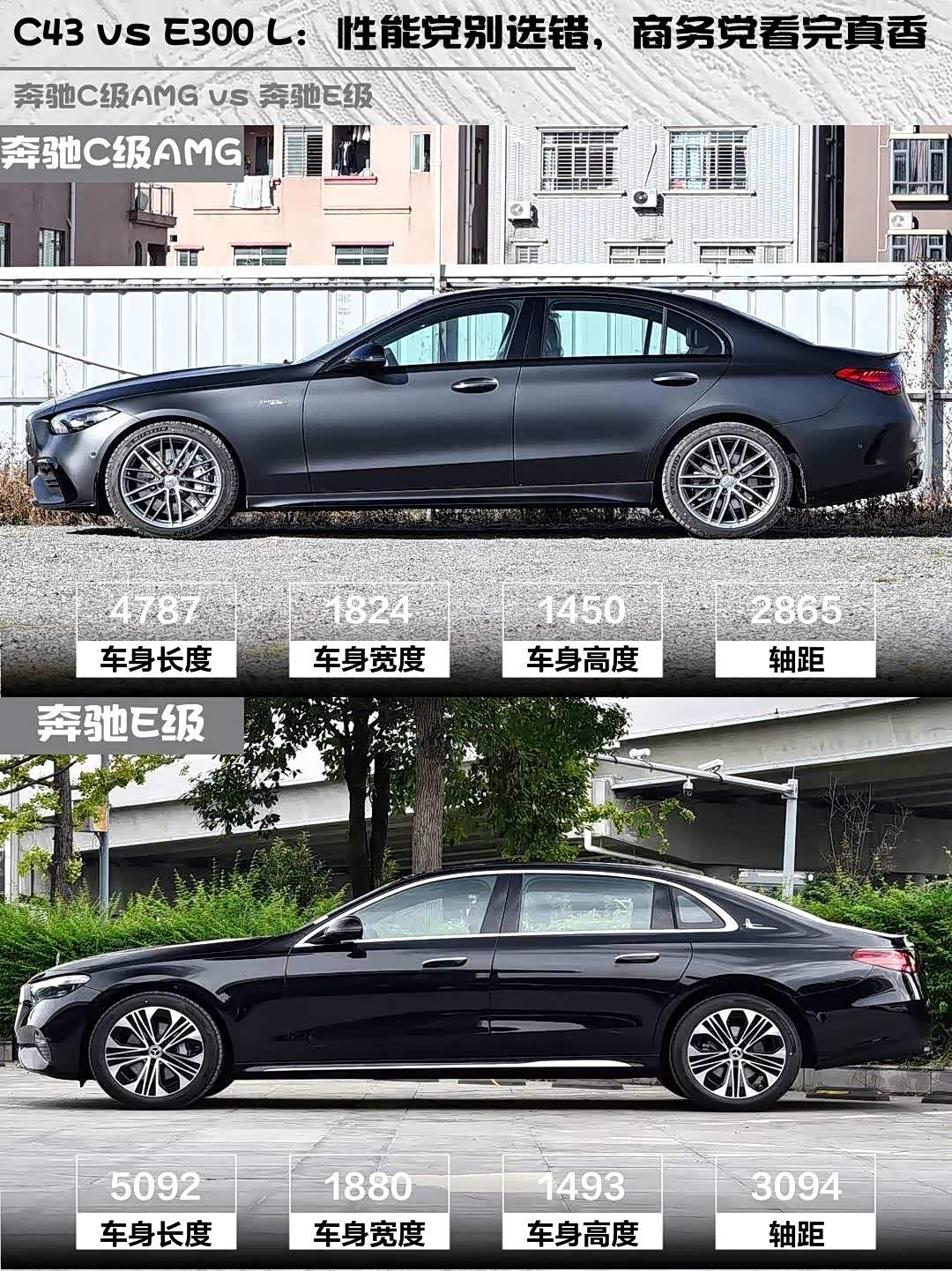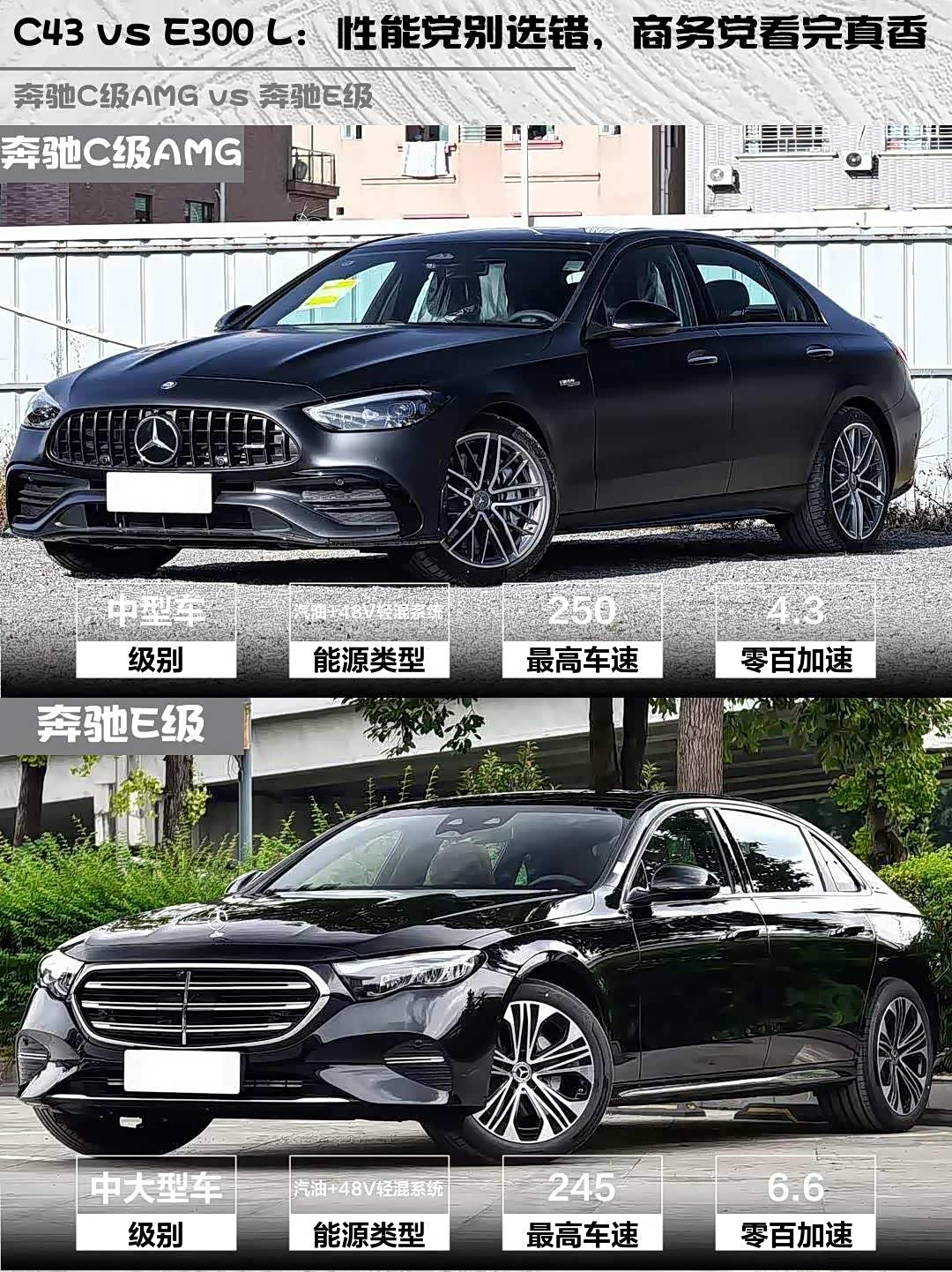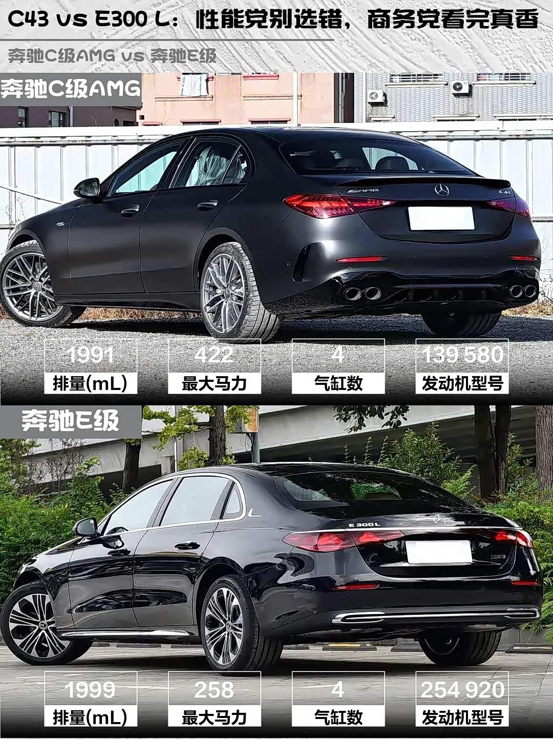 最近后台好多人在问这两台车怎么选,今天就来深度对比一下!先说结论:要性能选C43,要商务选E300 L!💪
