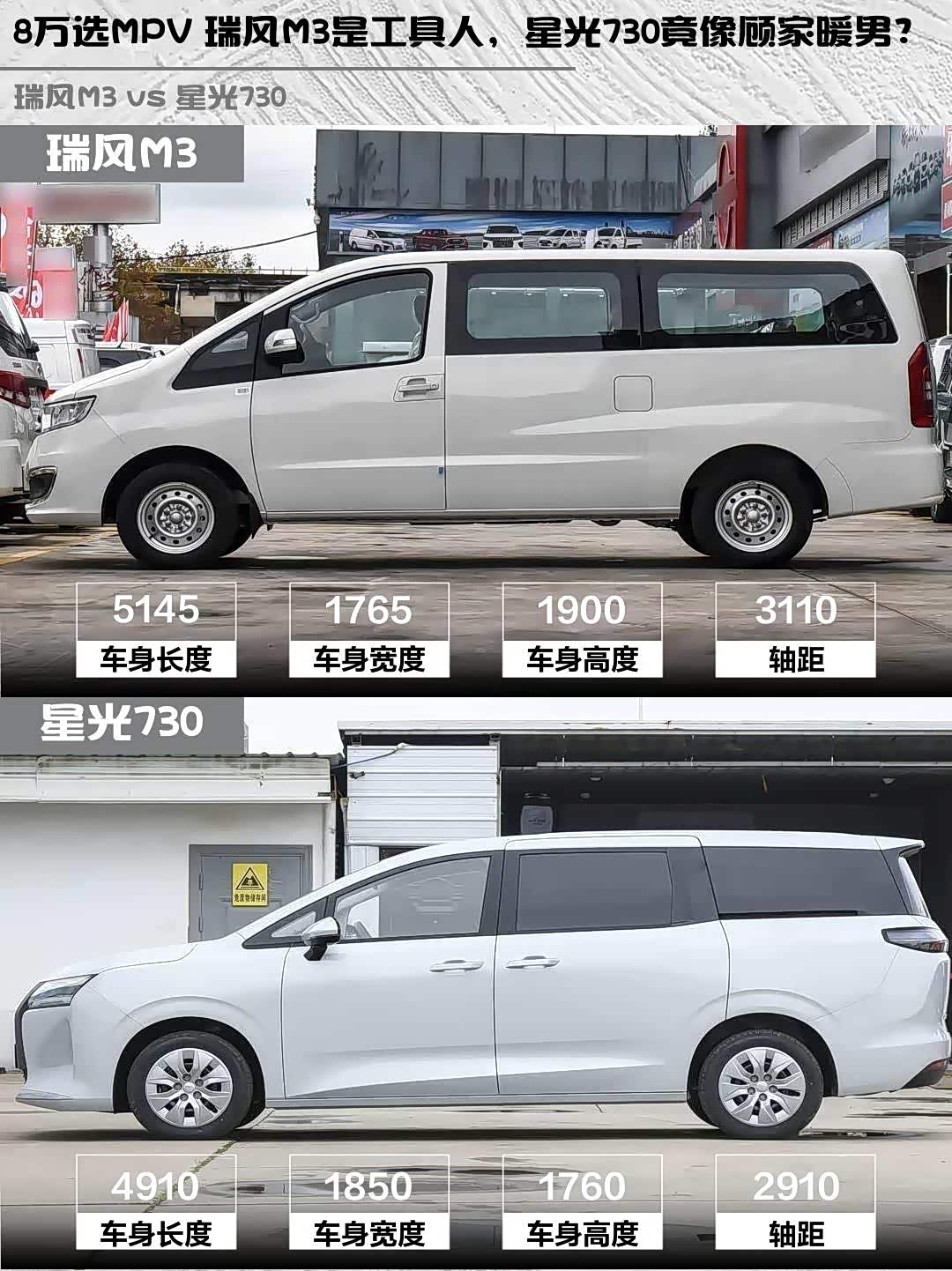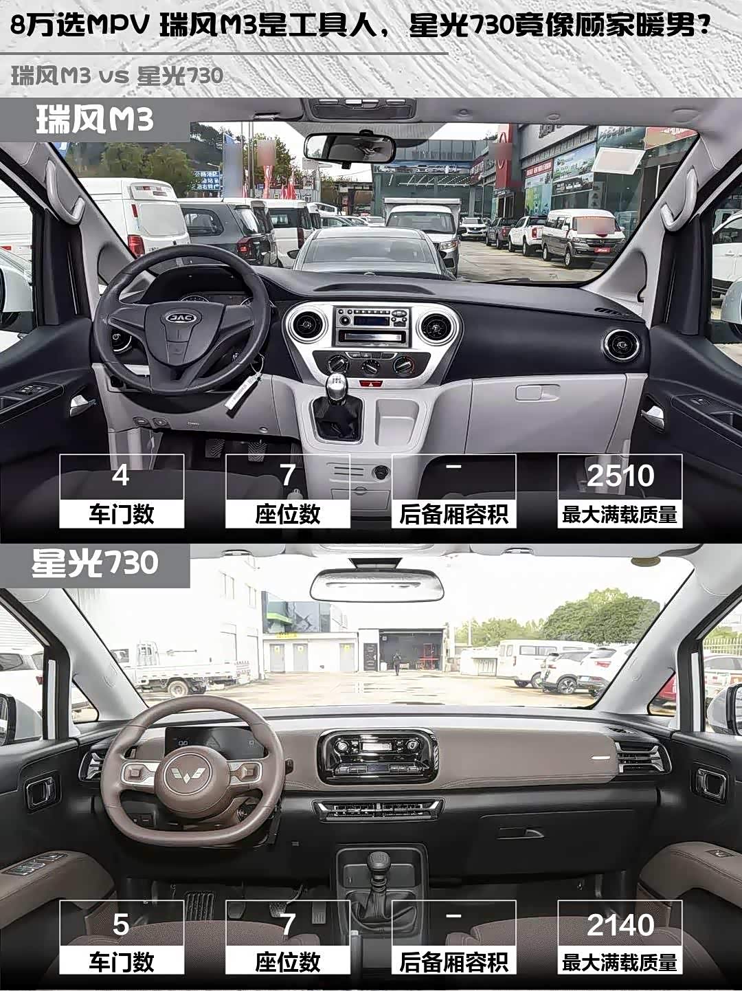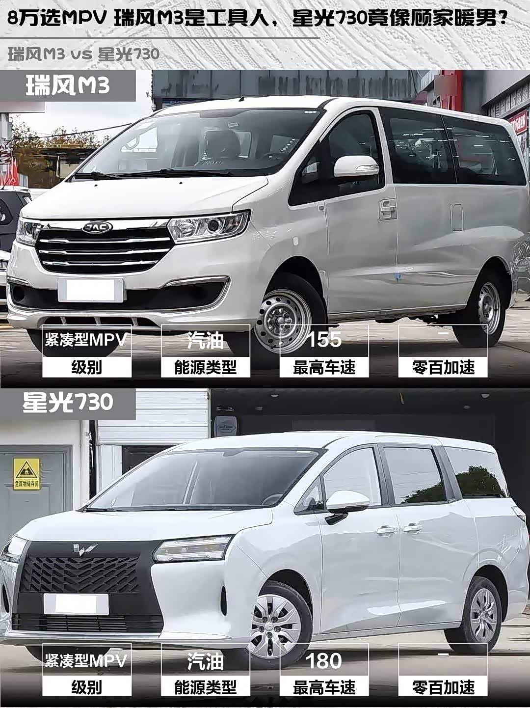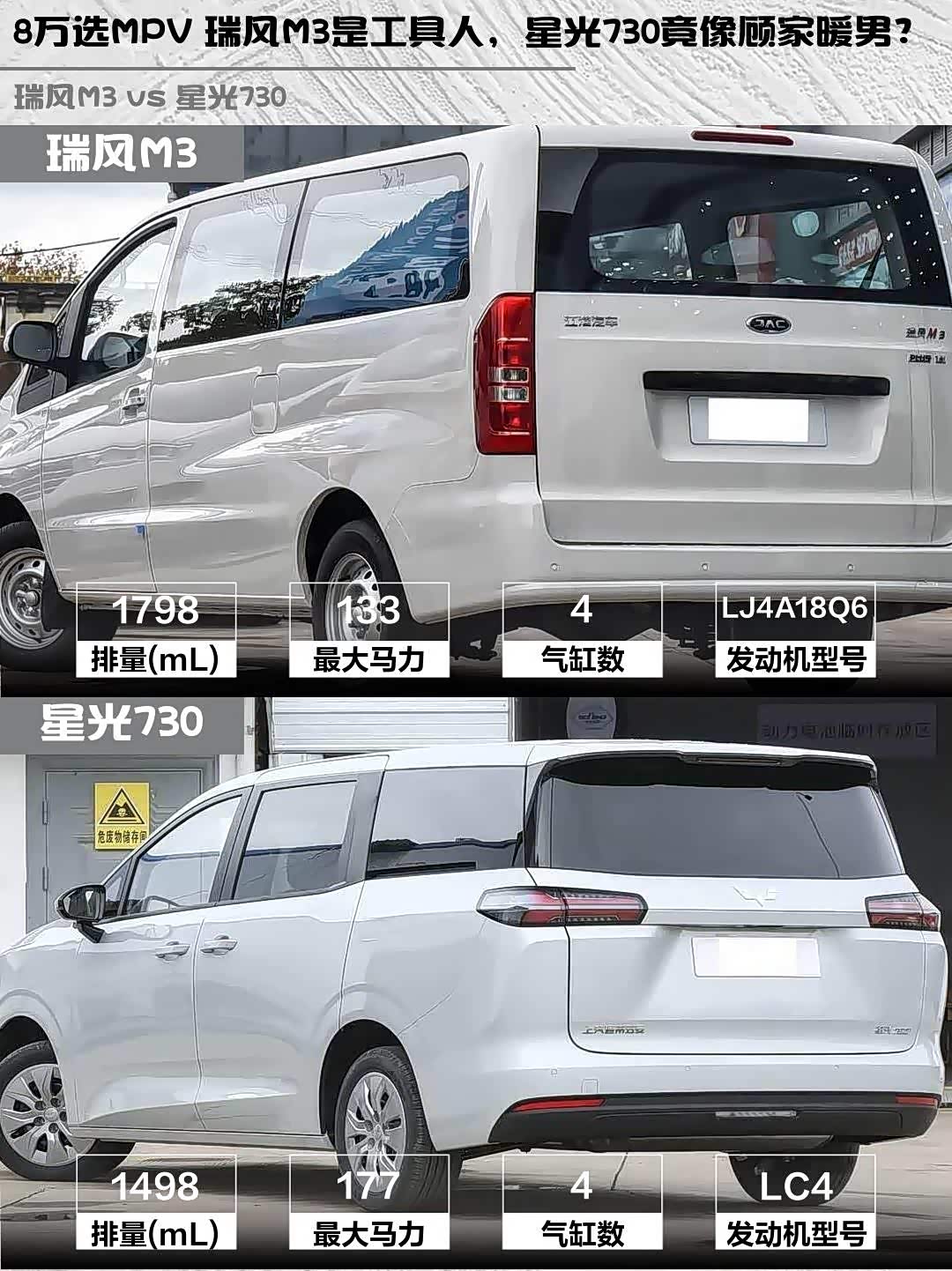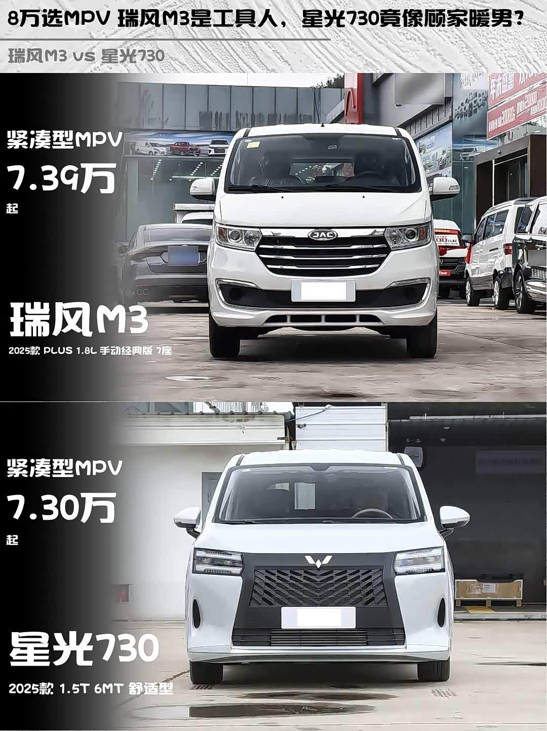 最近在帮朋友挑7座MPV,预算8万左右,对比了瑞风M3 2025款 PLUS 1.8L 手动经典版和 星光730(参数|询价) 2025款 1.5T 6MT 舒适型,发现两款车性格完全不同!一个像务实能干的工具人,一个像顾家暖男,赶紧来分享下真实对比感受👇