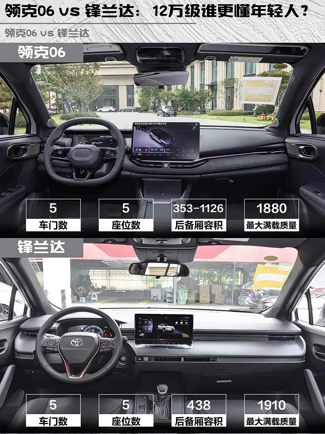 锋兰达后备箱438L确实能装,后排座椅放倒后堪比小货车!领克06后备箱只有353L,但放倒座椅能扩展到1126L,日常够用。不过领克06后排腿部空间稍局促,锋兰达坐垫更长,长途舒适性略胜一筹。