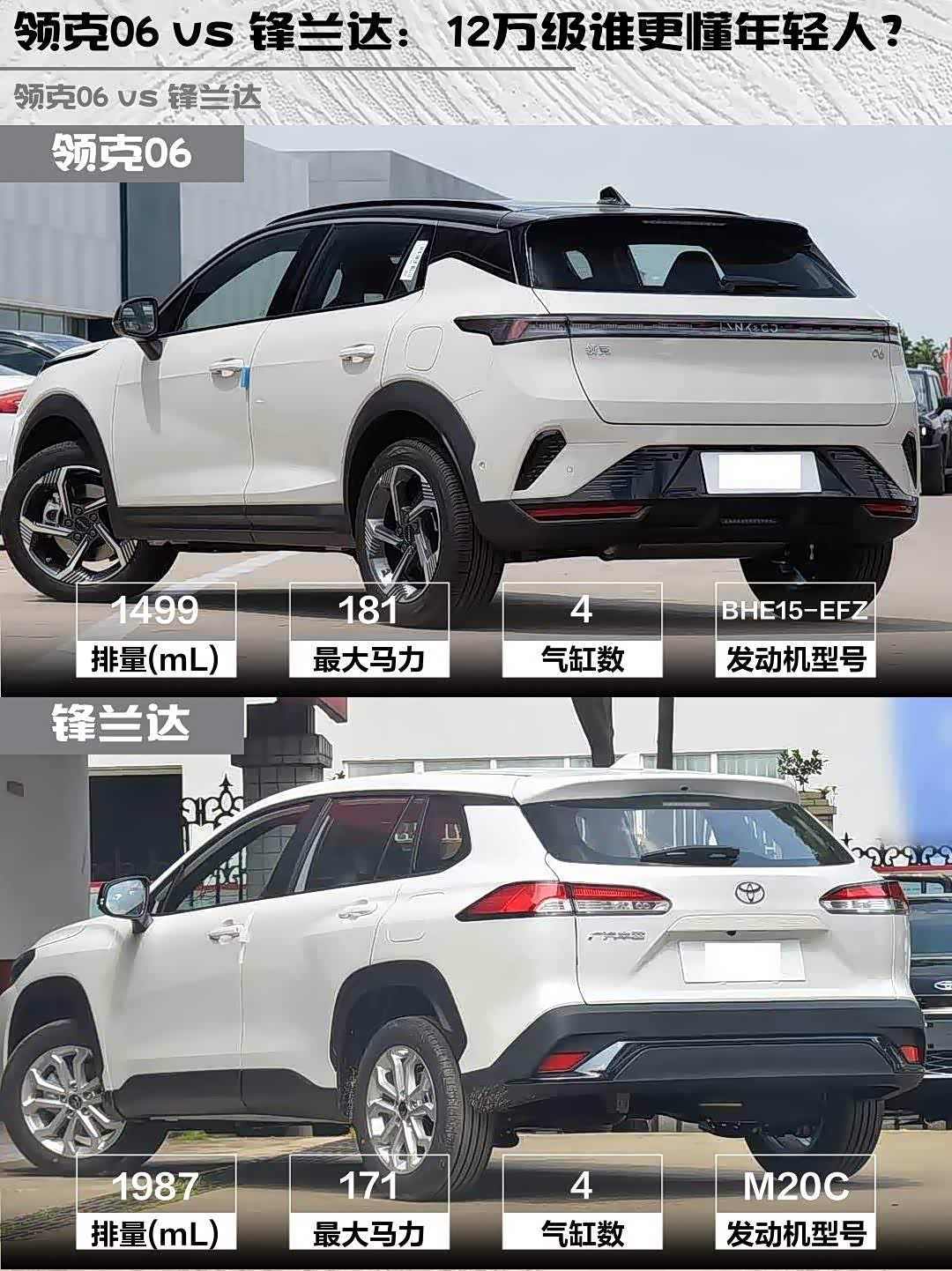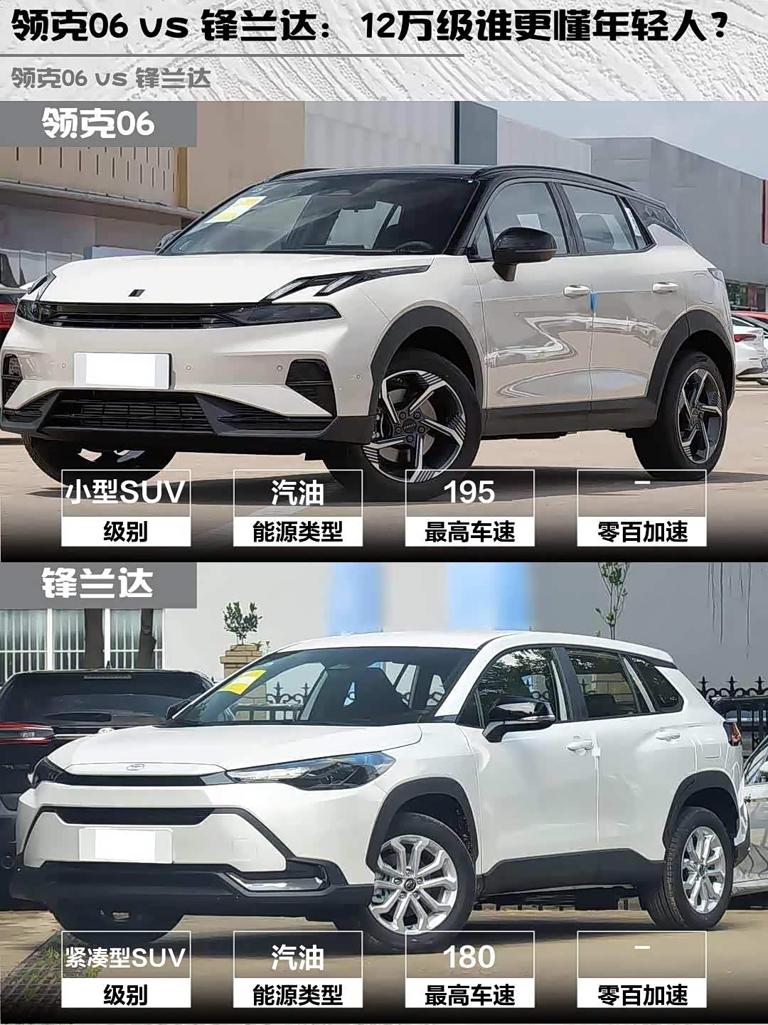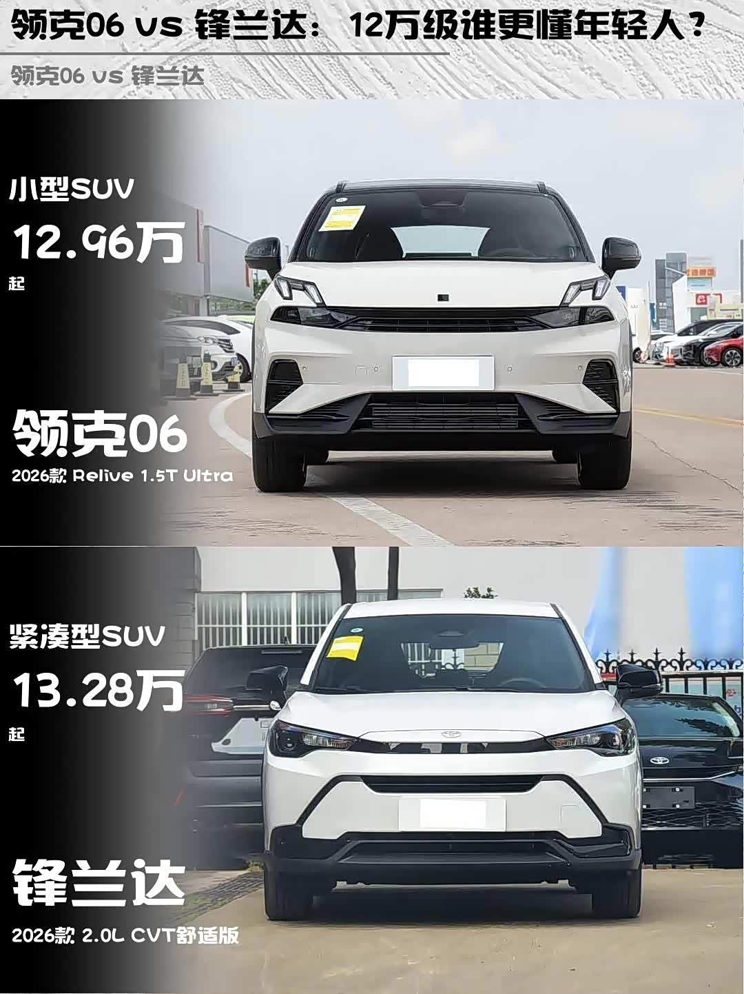 领克06(参数|询价) 2026款 Relive 1.5T Ultra vs 锋兰达 2026款 2.0L CVT舒适版,年轻人的第一台SUV该怎么选?🤔