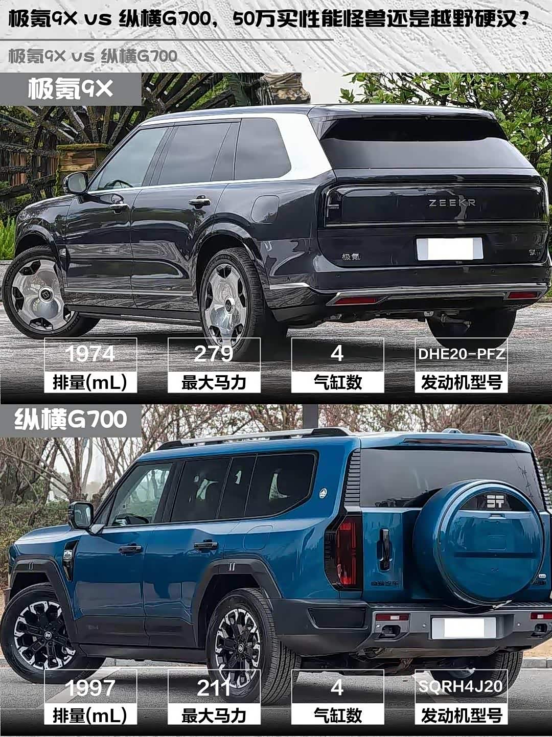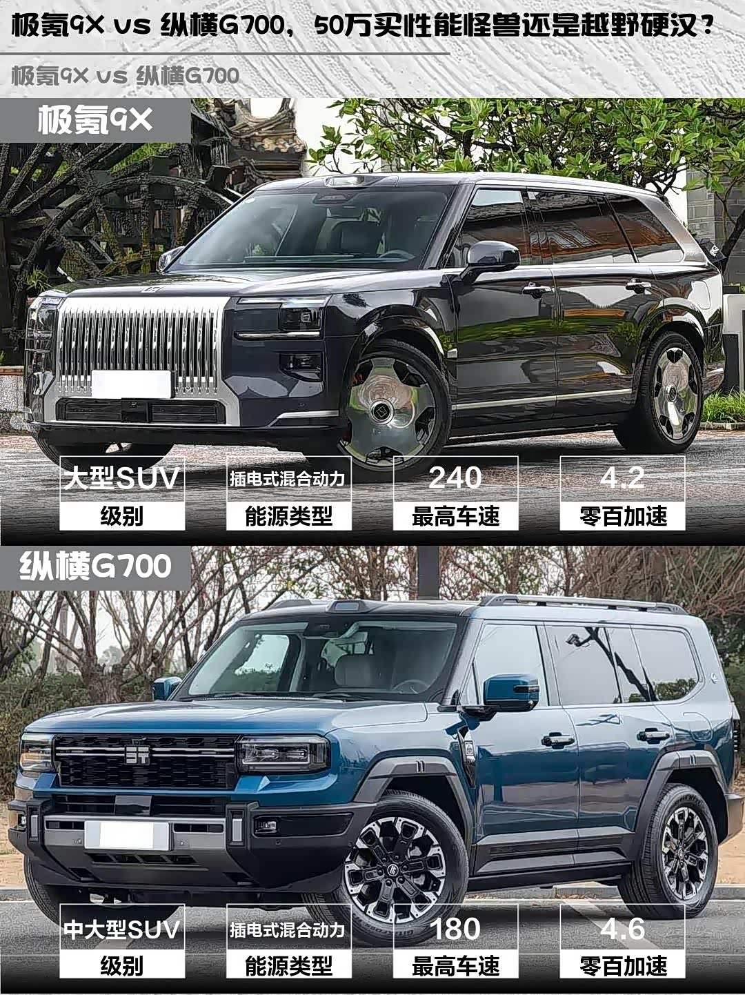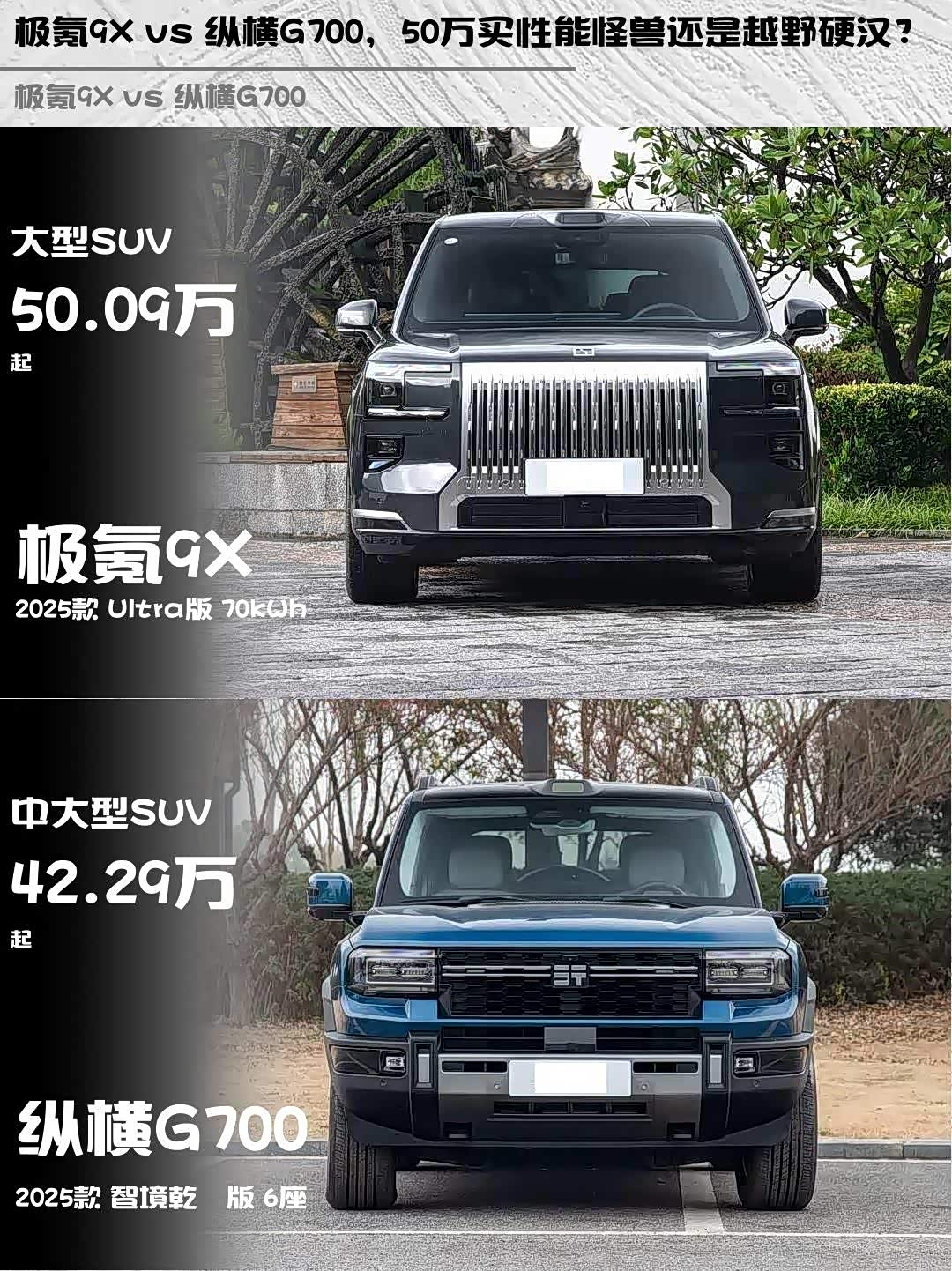 最近在选车的小伙伴看过来!今天给大家深度对比两款热门混动SUV——极氪9X 2025款 Ultra版 70kWh和 纵横G700(参数|询价) 2025款 智境乾崑版 6座,都是50万级的高端选手,但风格完全不同哦!🔥