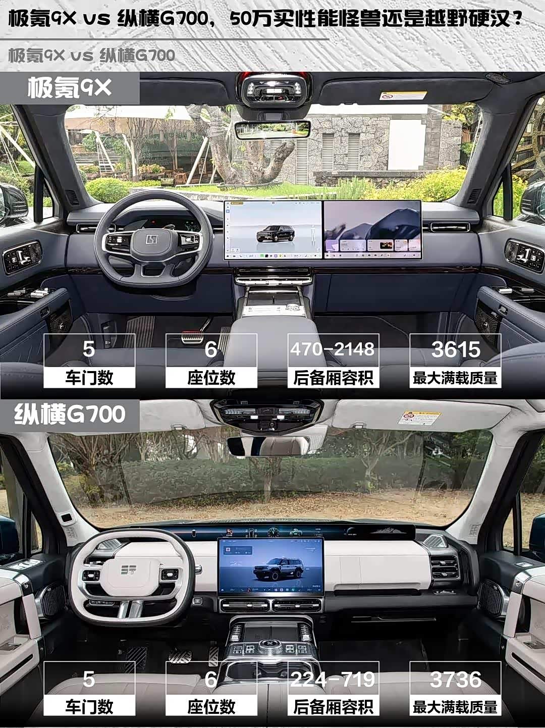 最后说下我的感受:极氪9X像穿着西装的运动员,G700像全副武装的探险家。要科技感和加速快感选极氪,要越野能力和性价比选G700。你们会pick哪款呢?