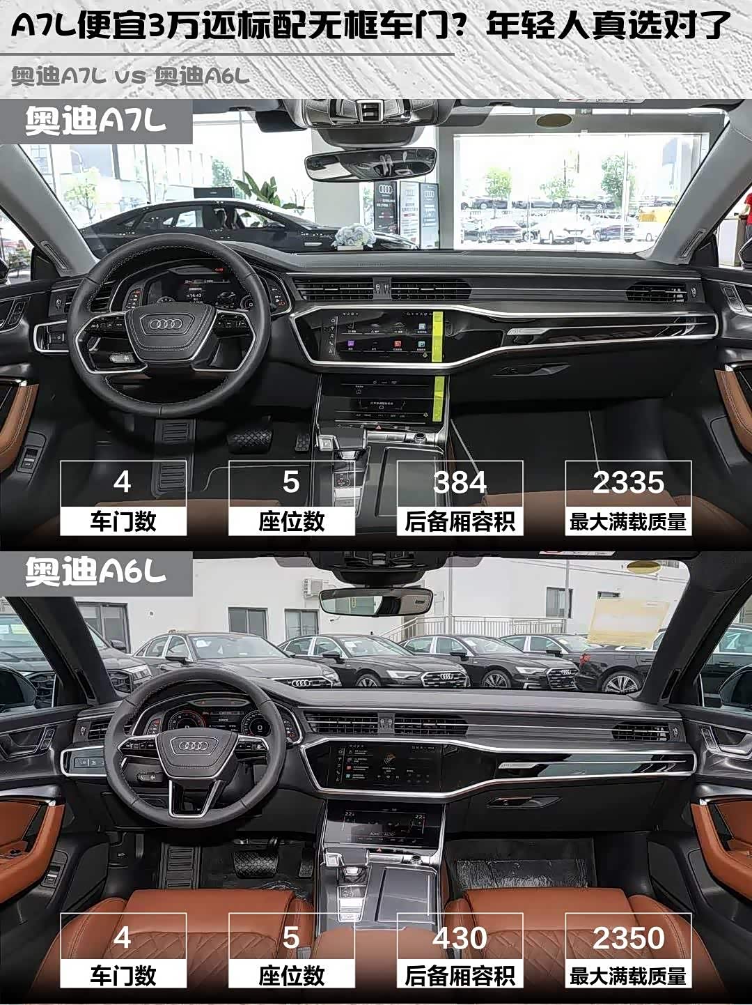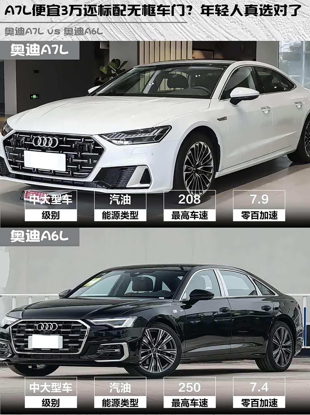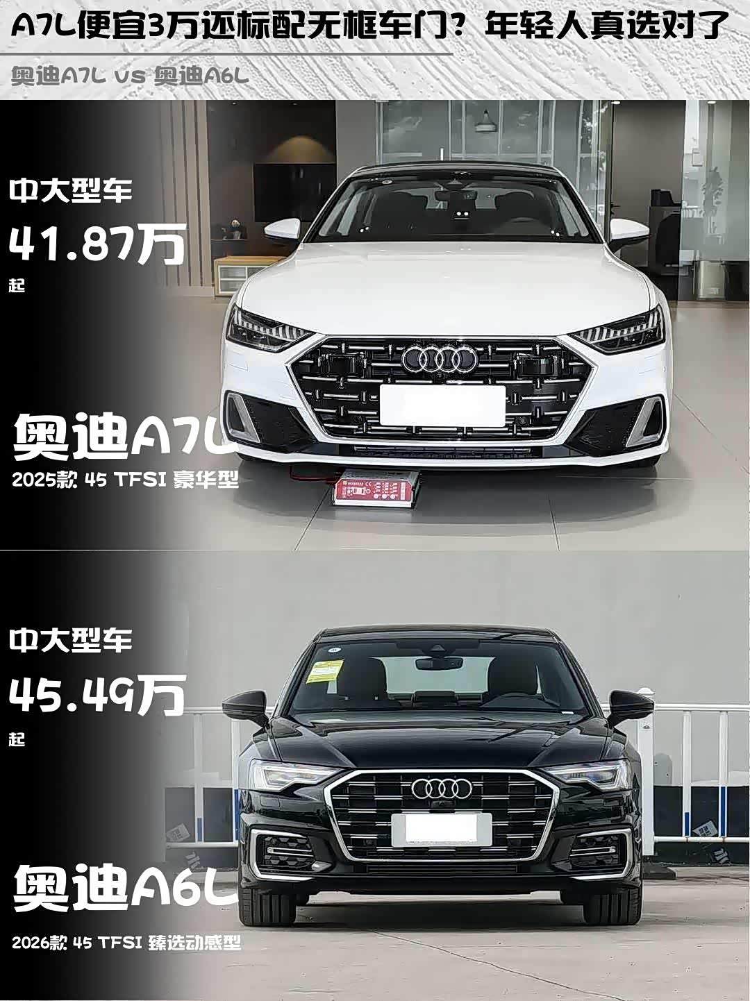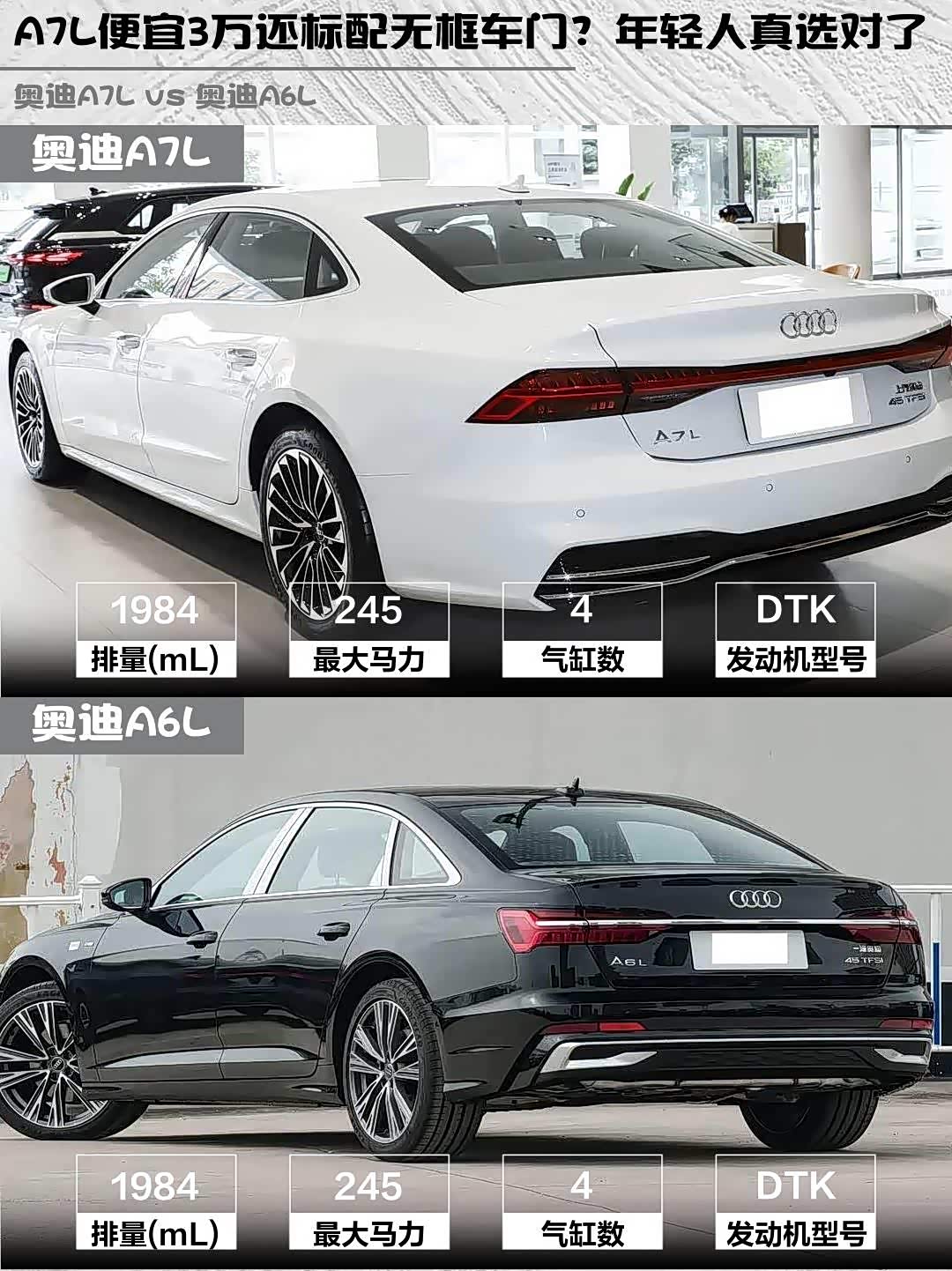 价格方面A7L指导价41.87万比A6L便宜3.6万,但A6L终端优惠更大,实际落地价反而可能更低。不过要说个性价比,A7L的无框车门+轿跑设计确实值这个差价!